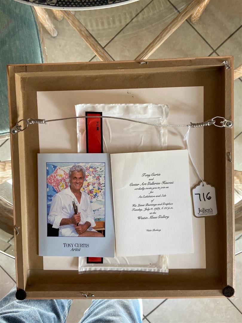 This is a 13X13" FRAMED pen & ink drawing by Tony Curtis, sketched in 1990 for his friend Jim Nabors, while they were dining at the Hotel Hana Maui. Tony wanted Jim to have his phone number and scrawled it on the paper tablecloth, along with this Matisse-like drawing. Included is a 4x6 signed postcard photo of Curtis. j.