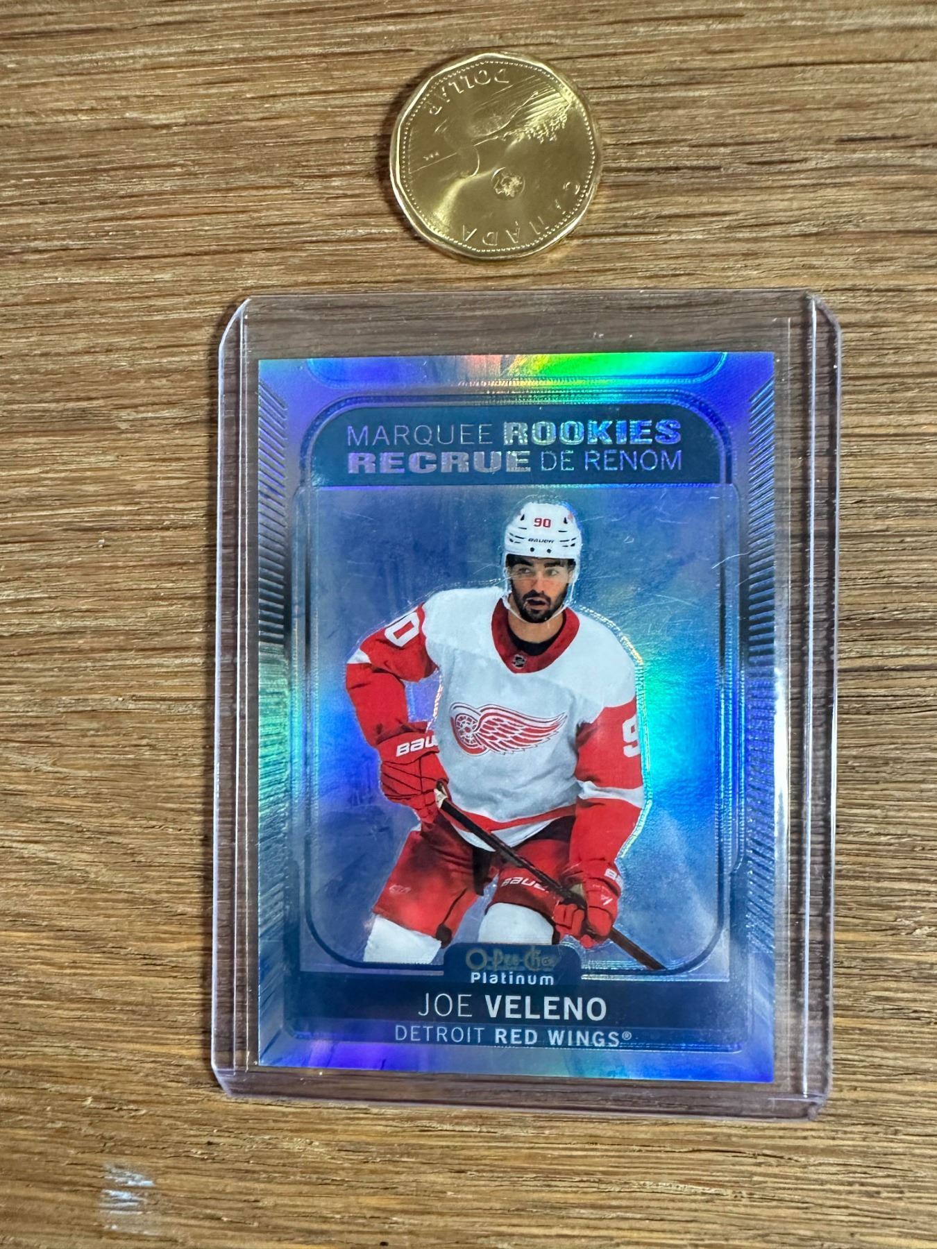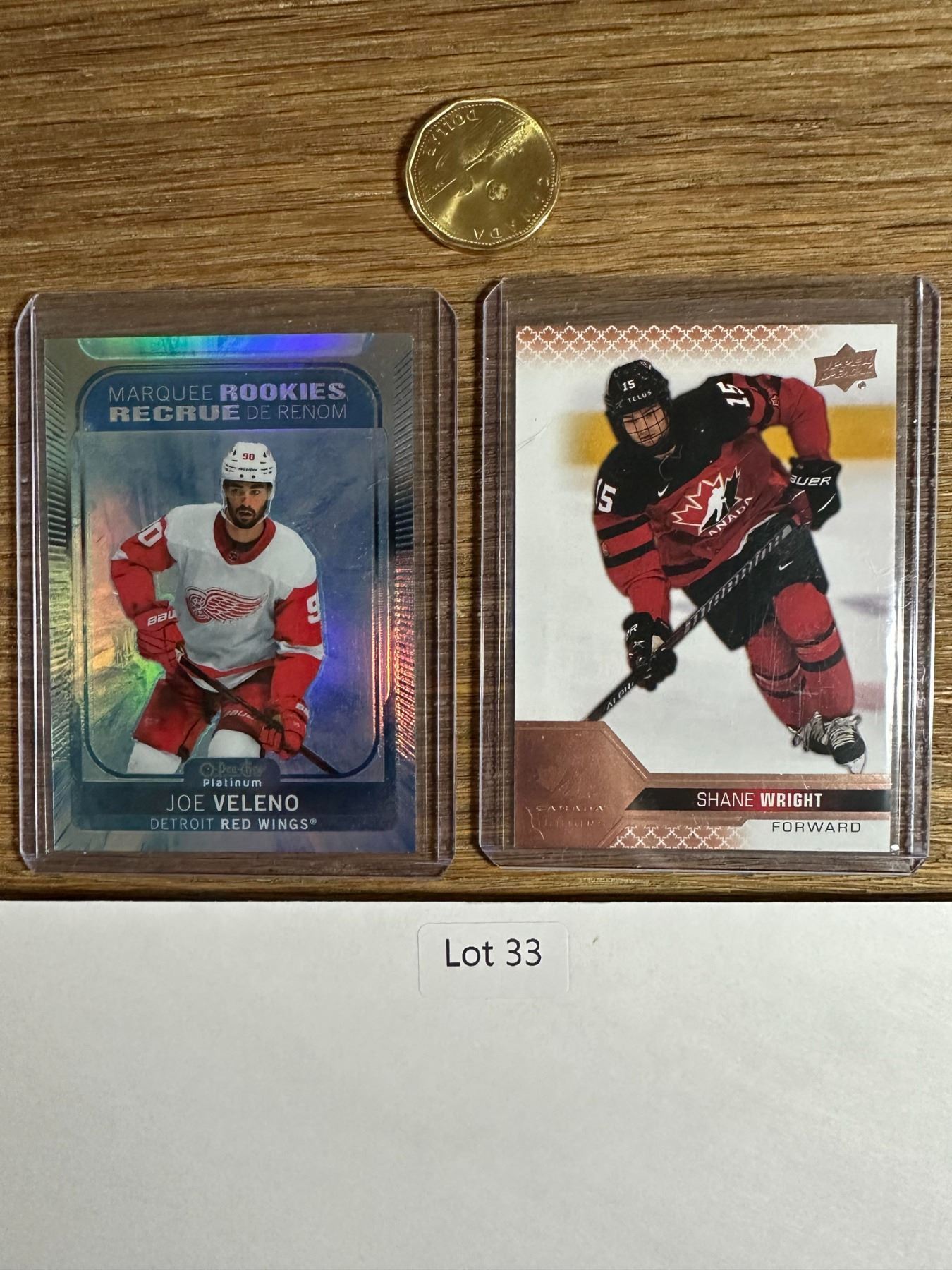 Two-card lot featuring Joe Veleno Marquee Rookies Arctic Freeze parallel (#94/99, Red Wings) and Shane Wright from 2022 Team Canada Juniors. Low-numbered parallel plus top prospect. - Hockey Card