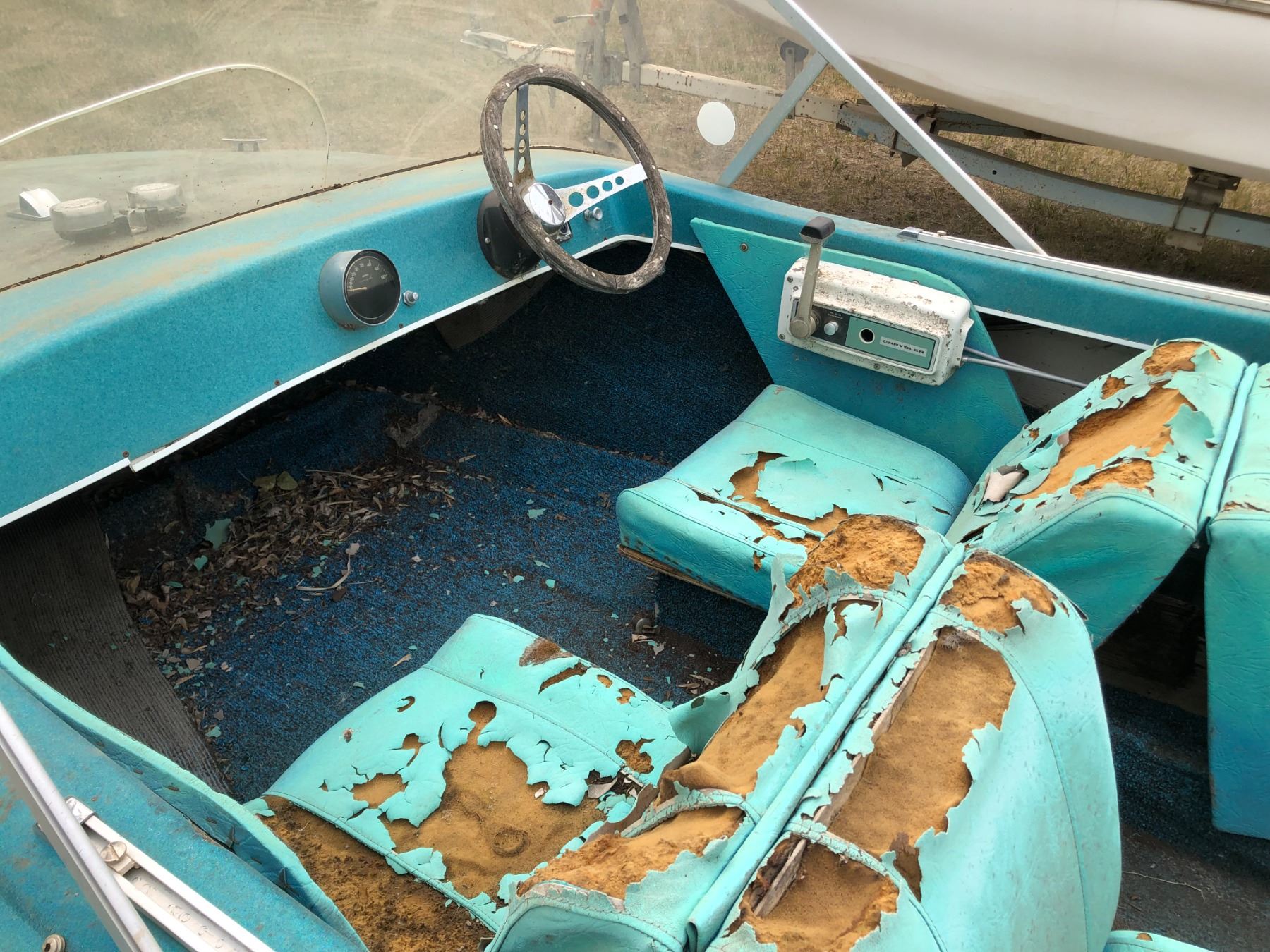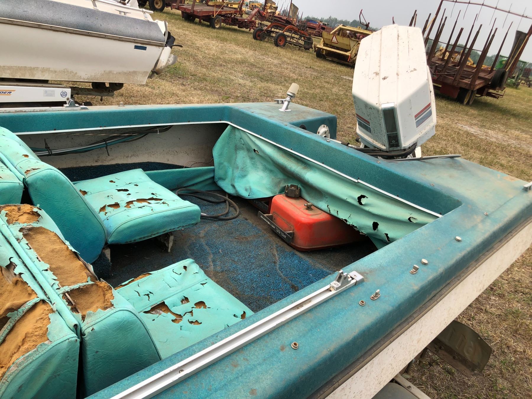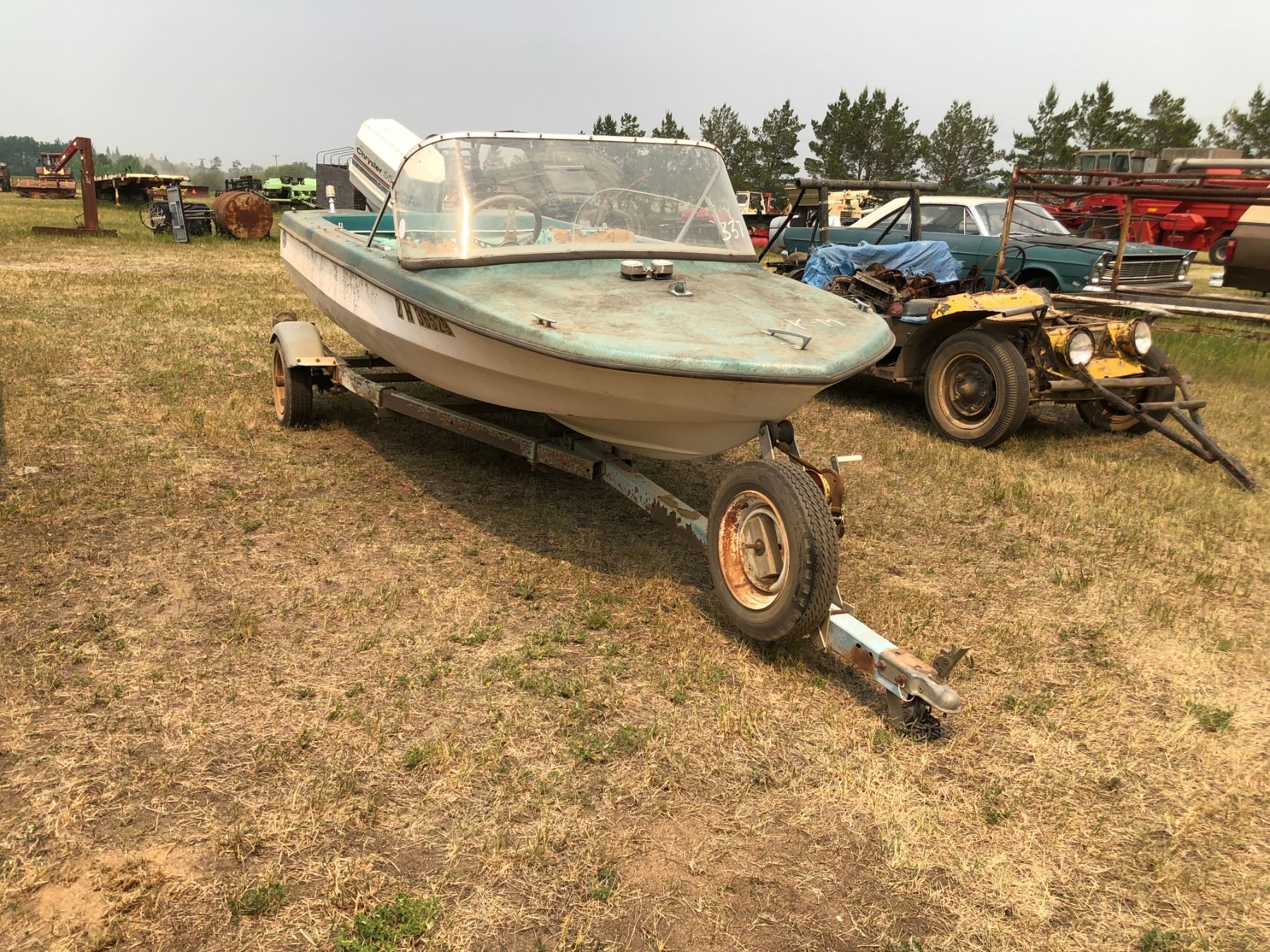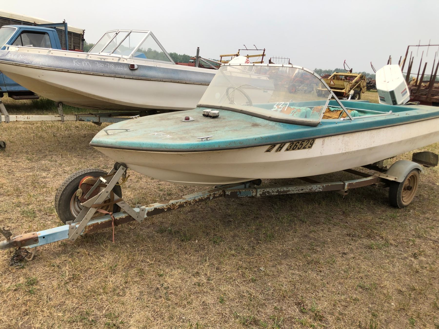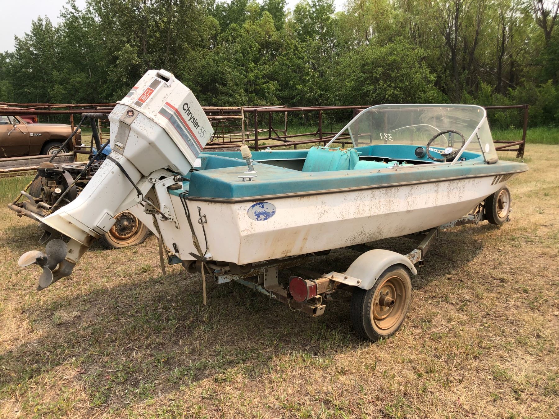 KM 14ft. Glasstrong Boat Blue & White no serial numbers visible Trailer c/w Chrysler 55 hp Sold with Bill of Sale Only