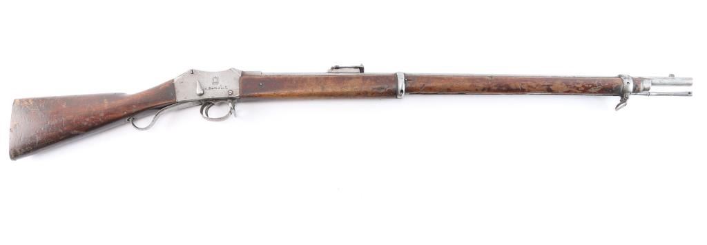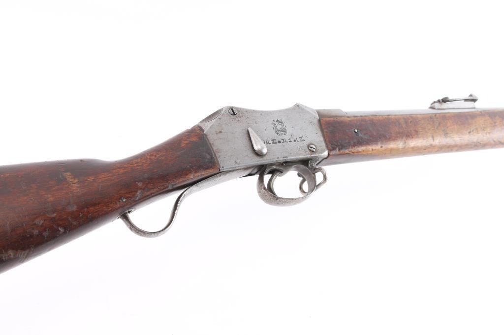 Copy of the British Martini-Henry rifle manufactured at the Kabul arsenal in Afghanistan, circa 1880s-1890s. Stamped Afghan 'Mosque' on right side of receiver with Dari script underneath, 33" barrel, small raised blade front sight and flip-up ladder type adjustable rear sight, two barrel bands, bayonet lug on left side of front band, two sling swivels, cleaning rod under barrel, serrated trigger, cocked indicator, two piece stock, butt stock w/metal butt plate. Falling block action is smooth/tight, Bore is dark with good rifling and some rust, metal cleaned displaying finish a gray patina with small scattered pitting, dents and dings. Markings are clear, wood is fair with scratches, deep dents and scarring. NRA Condition is good as ***Antique Firearm***.