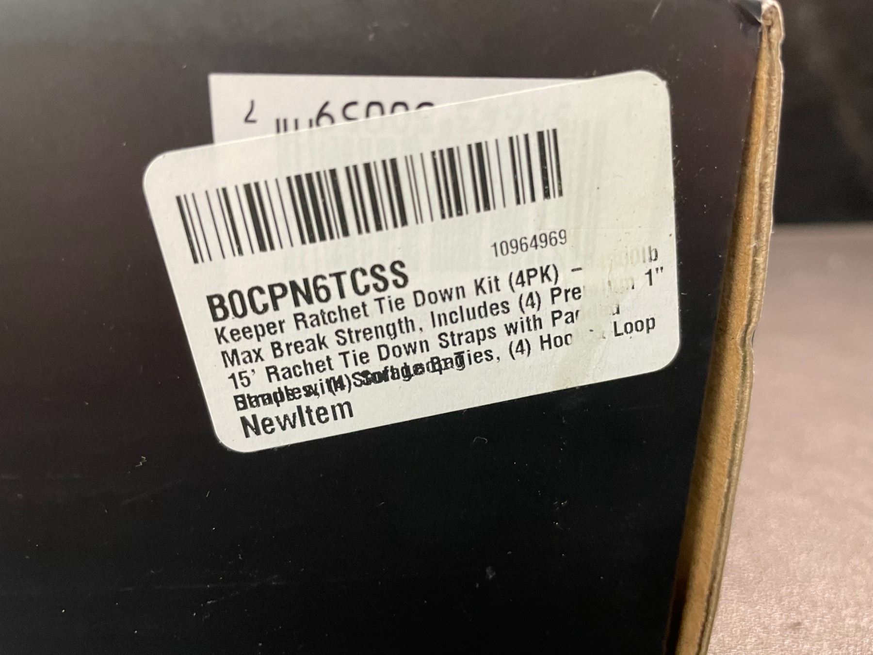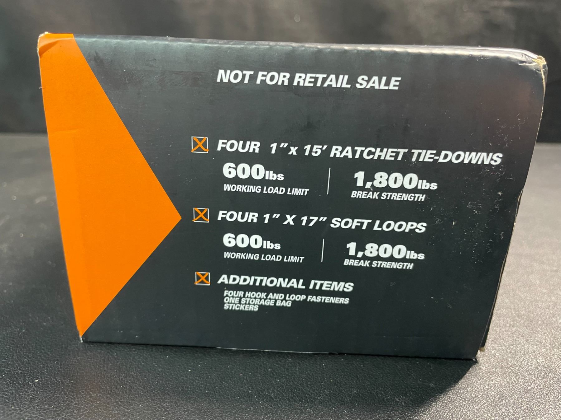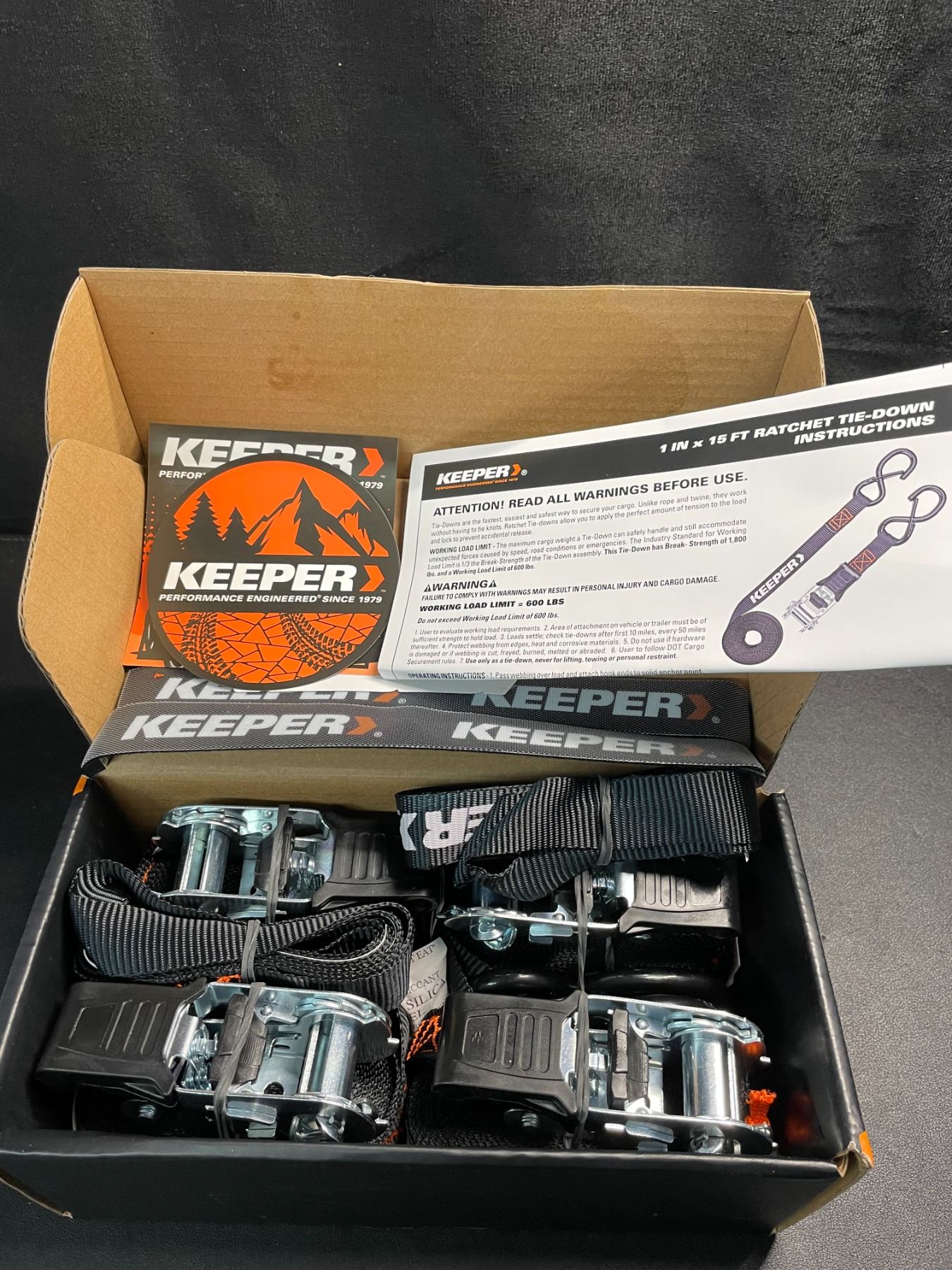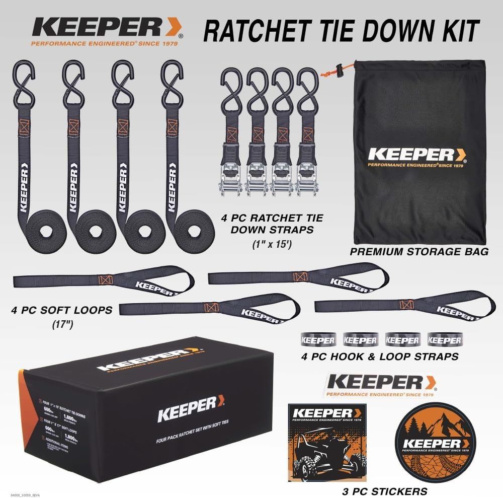 Keeper Ratchet Tie Down Kit (4PK) – 1800lb Max Break Strength, Includes (4) Premium 1" x 15' Rachet Tie Down Straps with Padded Handles, (4) Soft Loop Ties, (4) Hook & Loop Straps with Storage Bag