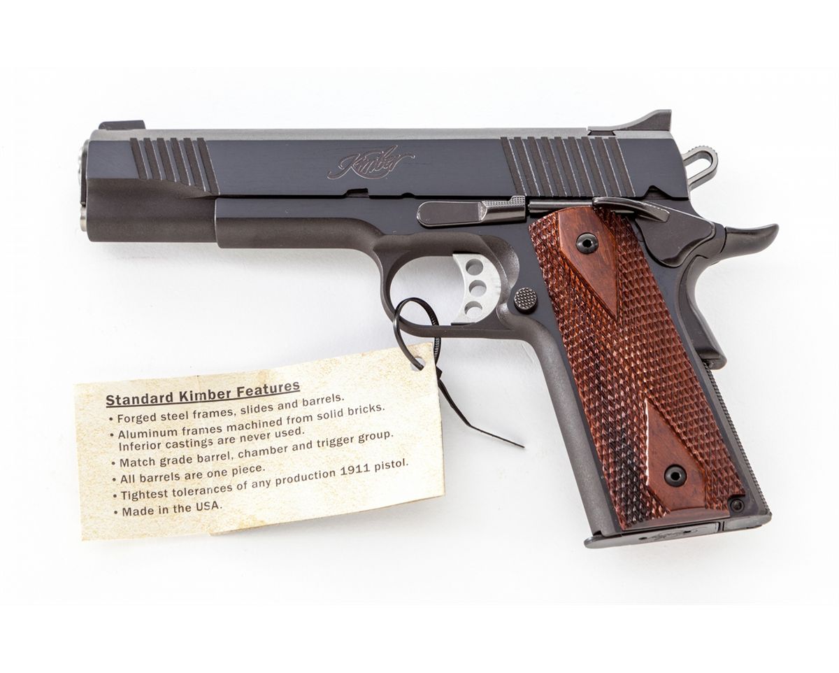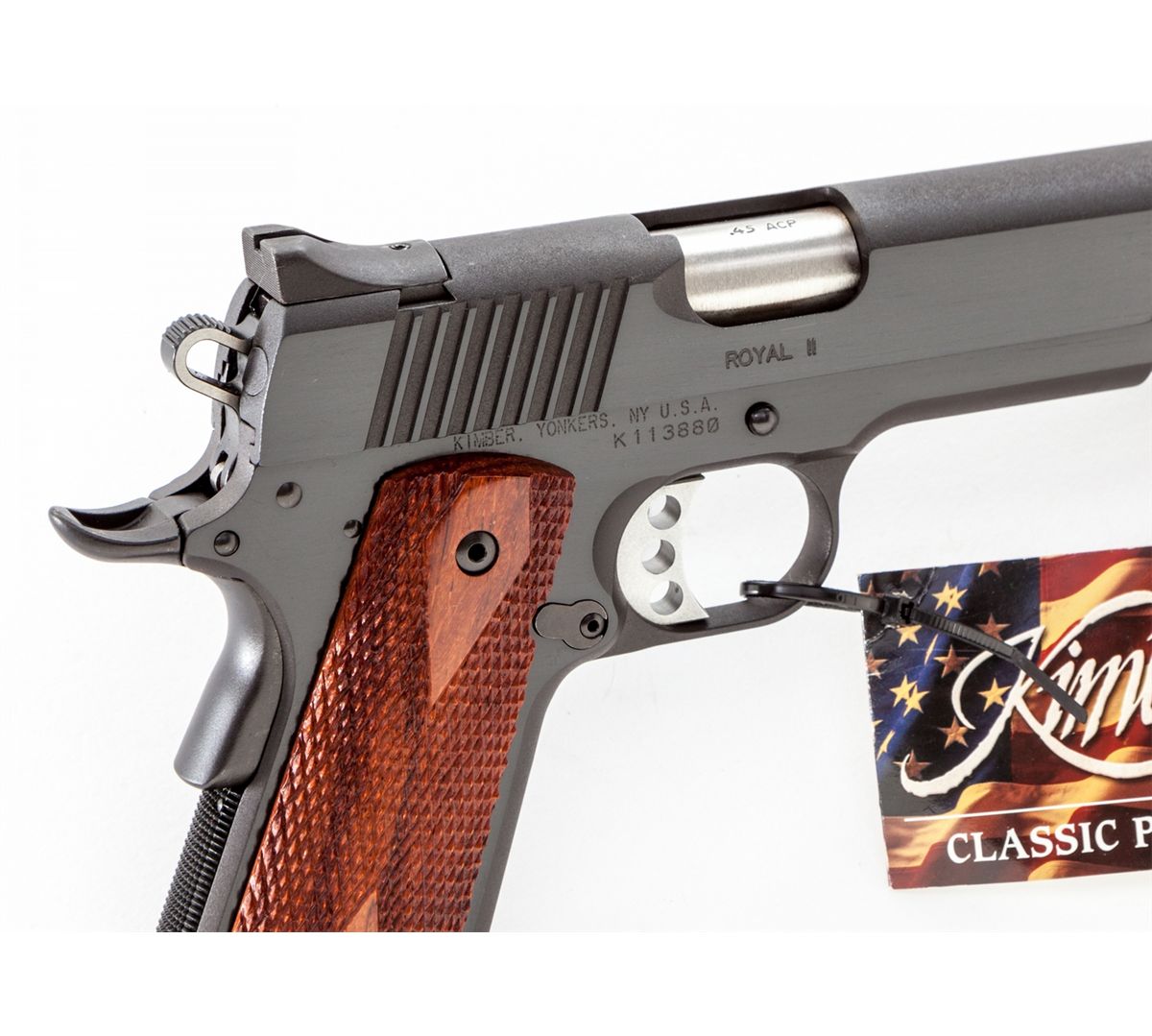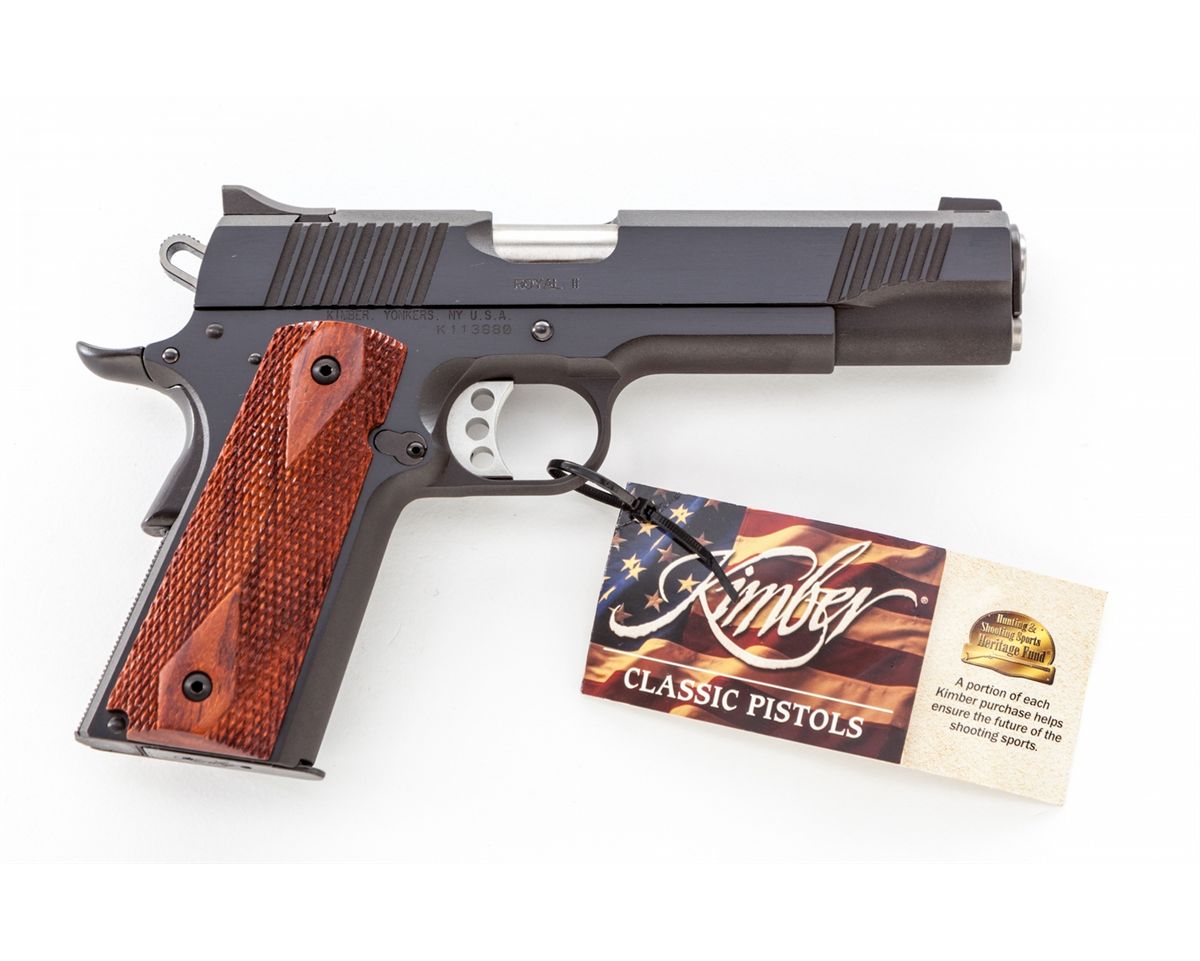 Kimber Royal II Semi-Automatic Pistol, #K113880, .45 ACP cal., 5'' barrel, blue finish, factory checkered hardwood grips. Condition is excellent, appearing as new and unfired, in original box. Est.: $1,500-$2,000. (Modern)
