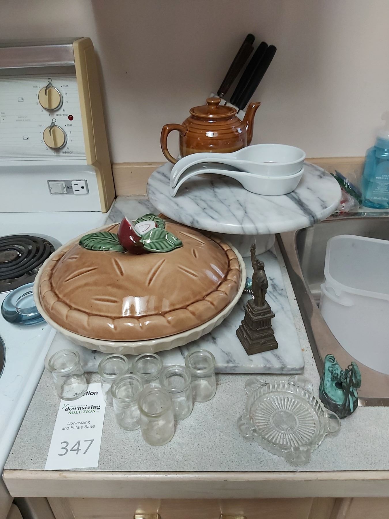 Ceramic pie plate, marble tray, cake tray, knives in marble block, and more included. Pickup 9 am cat. A.
