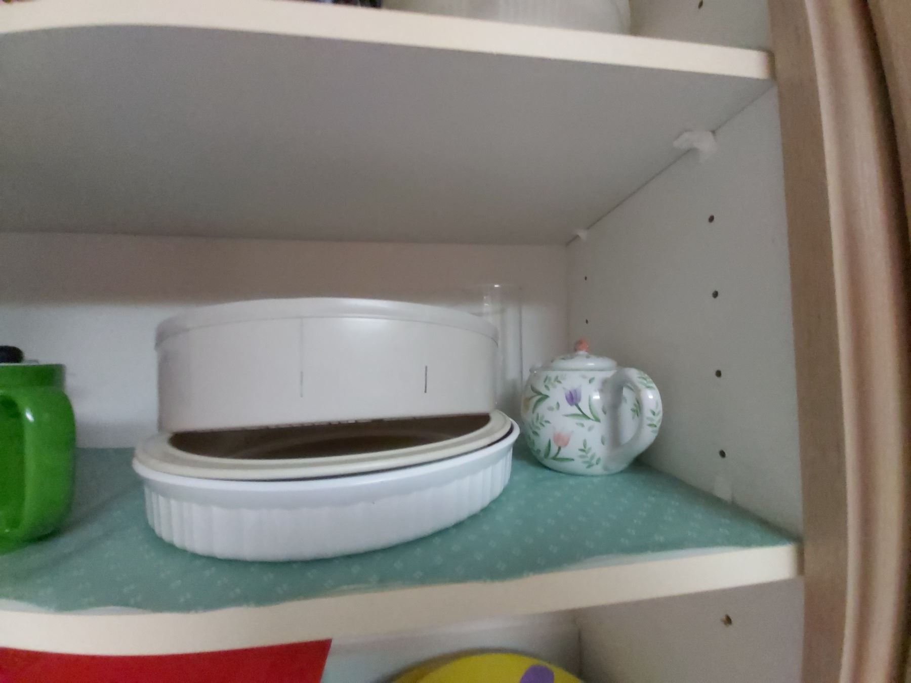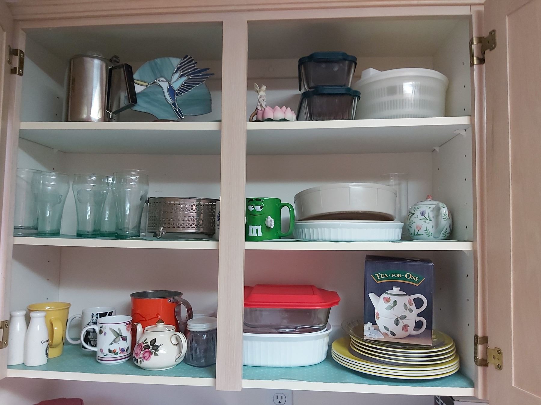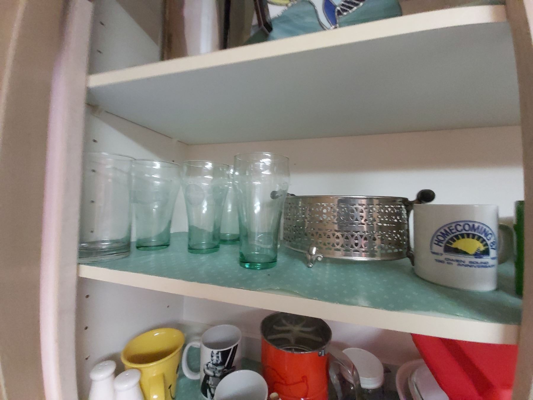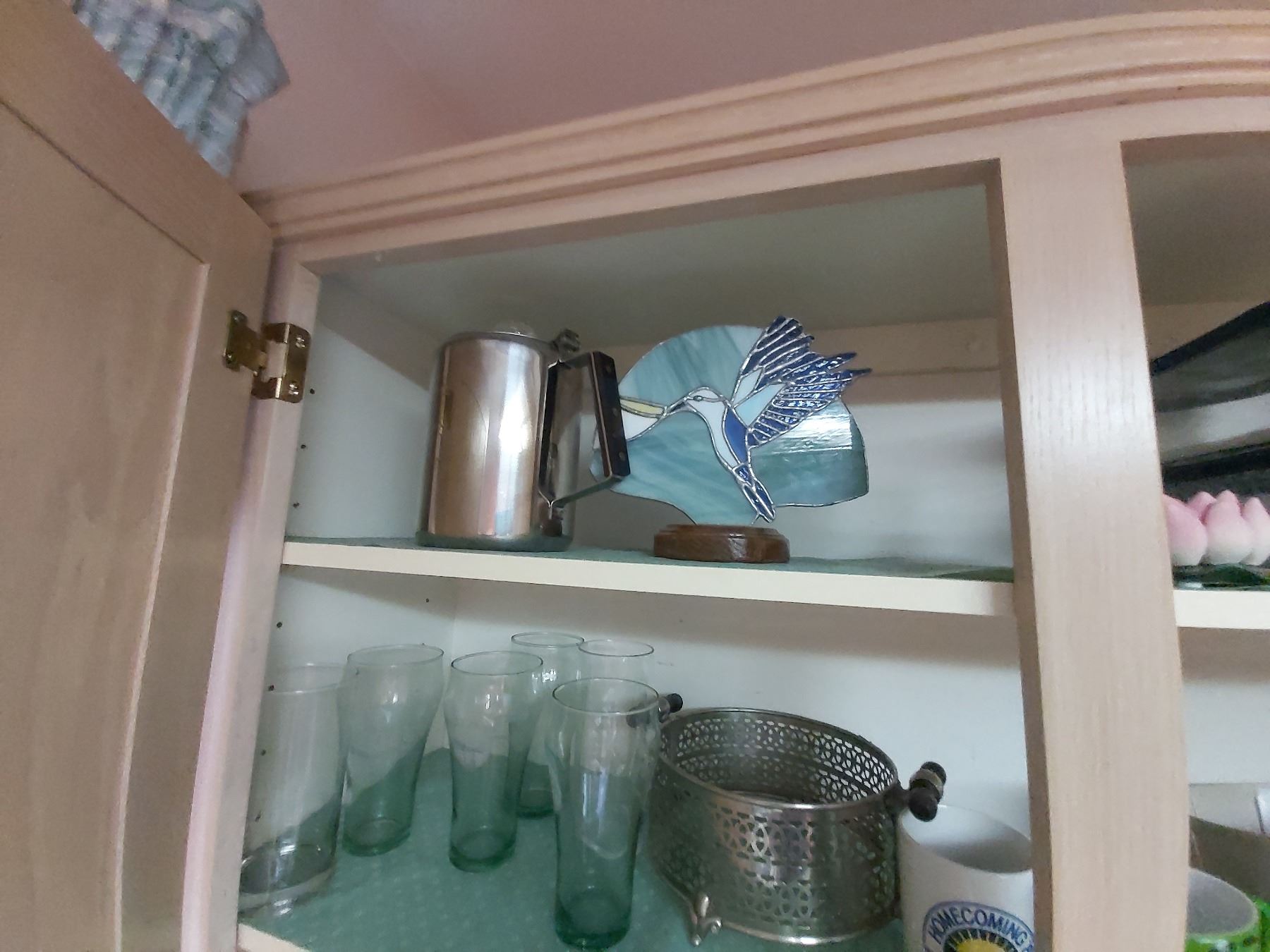 Assorted cups, plates, glasses, coffee pot, teapots, stained glass bird, and more on 3 shelves. Bring packing material. Pickup 9 am cat. A.