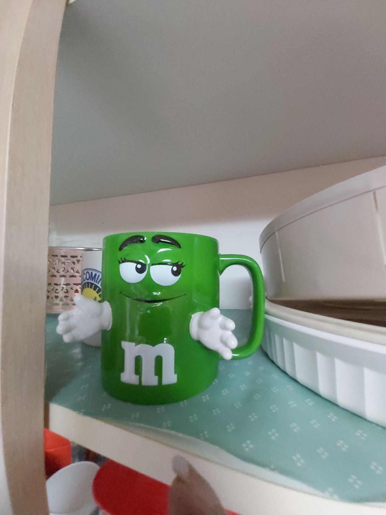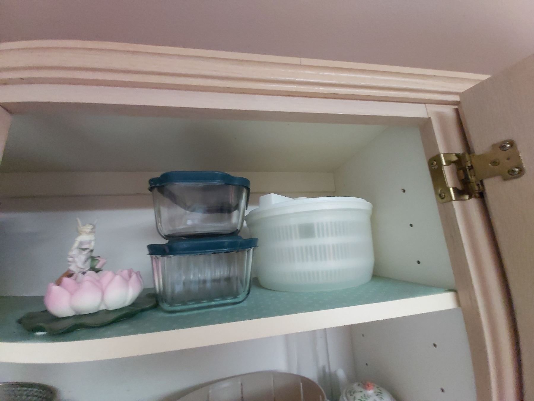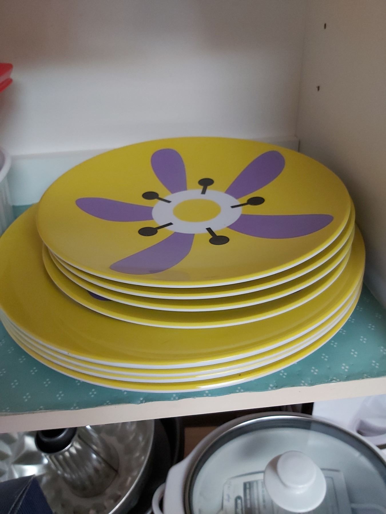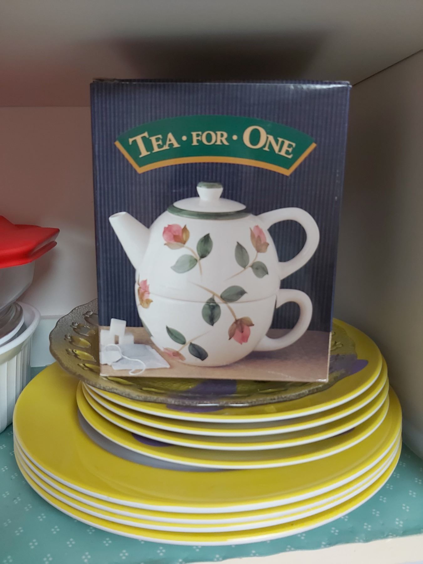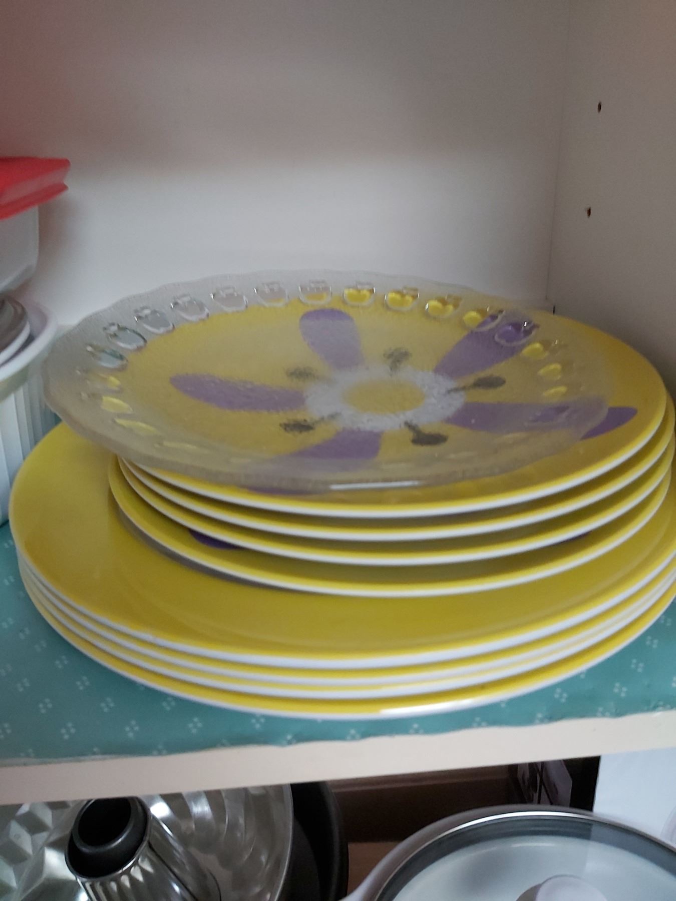 Assorted cups, plates, glasses, coffee pot, teapots, stained glass bird, and more on 3 shelves. Bring packing material. Pickup 9 am cat. A.