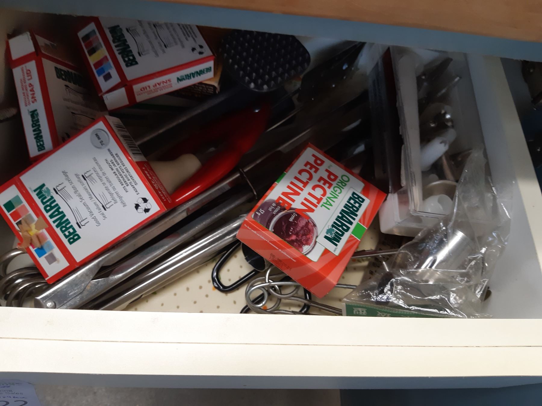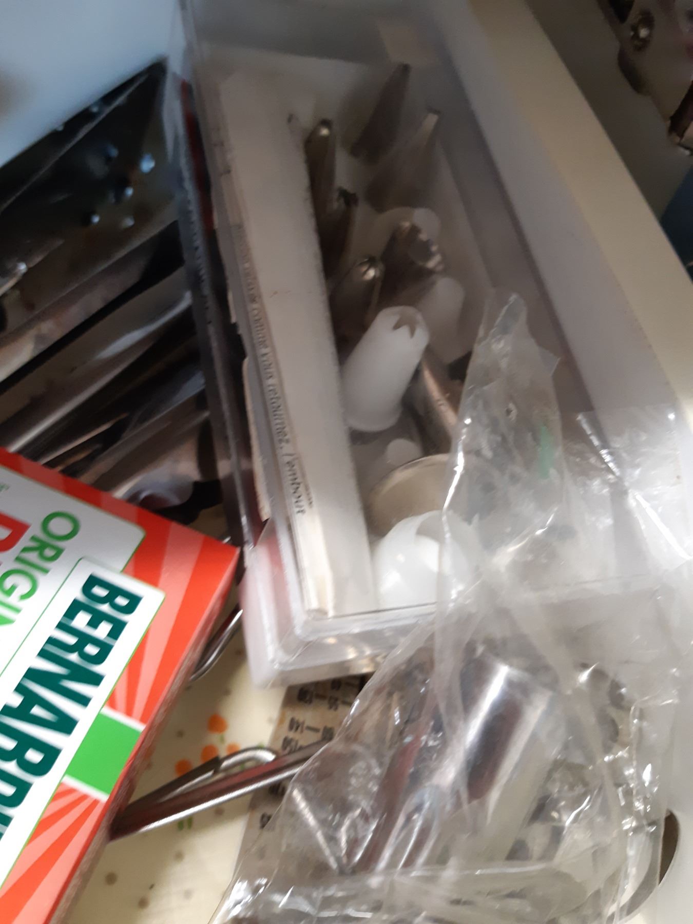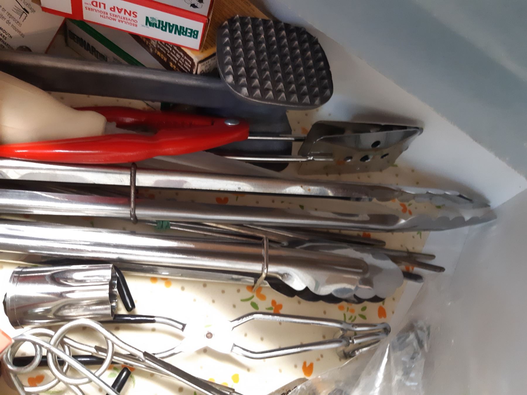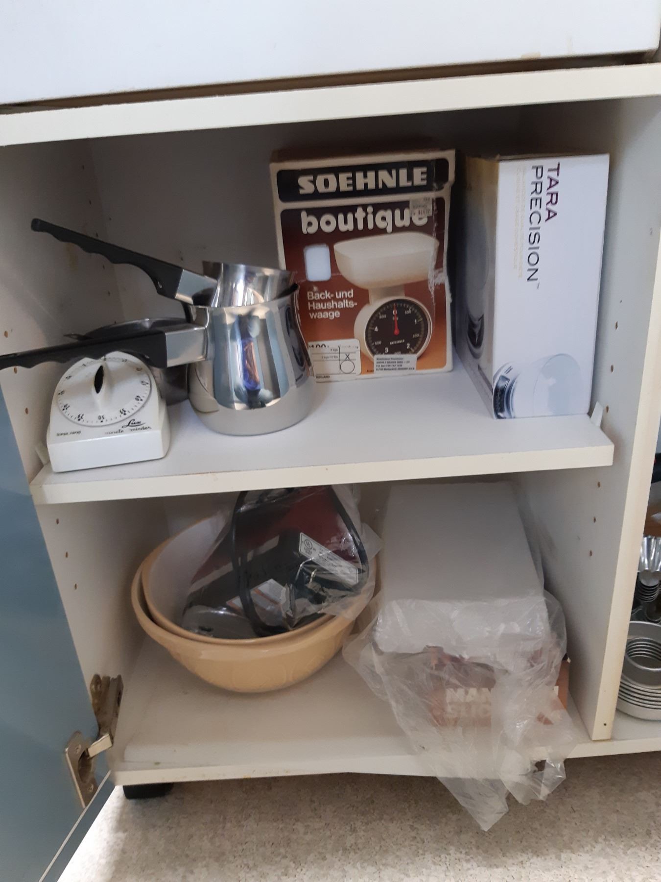 Kitchen aid hand mixer, scales, stainless steel milk warmers, bowls, ceramic mixing bowls.kitchen utensils in 2 drawers above. Bring packing material and pickup at 9 am