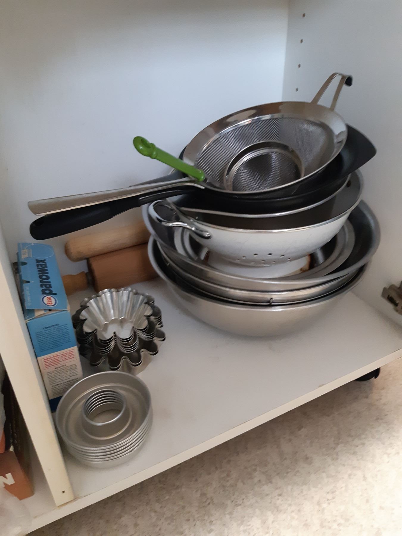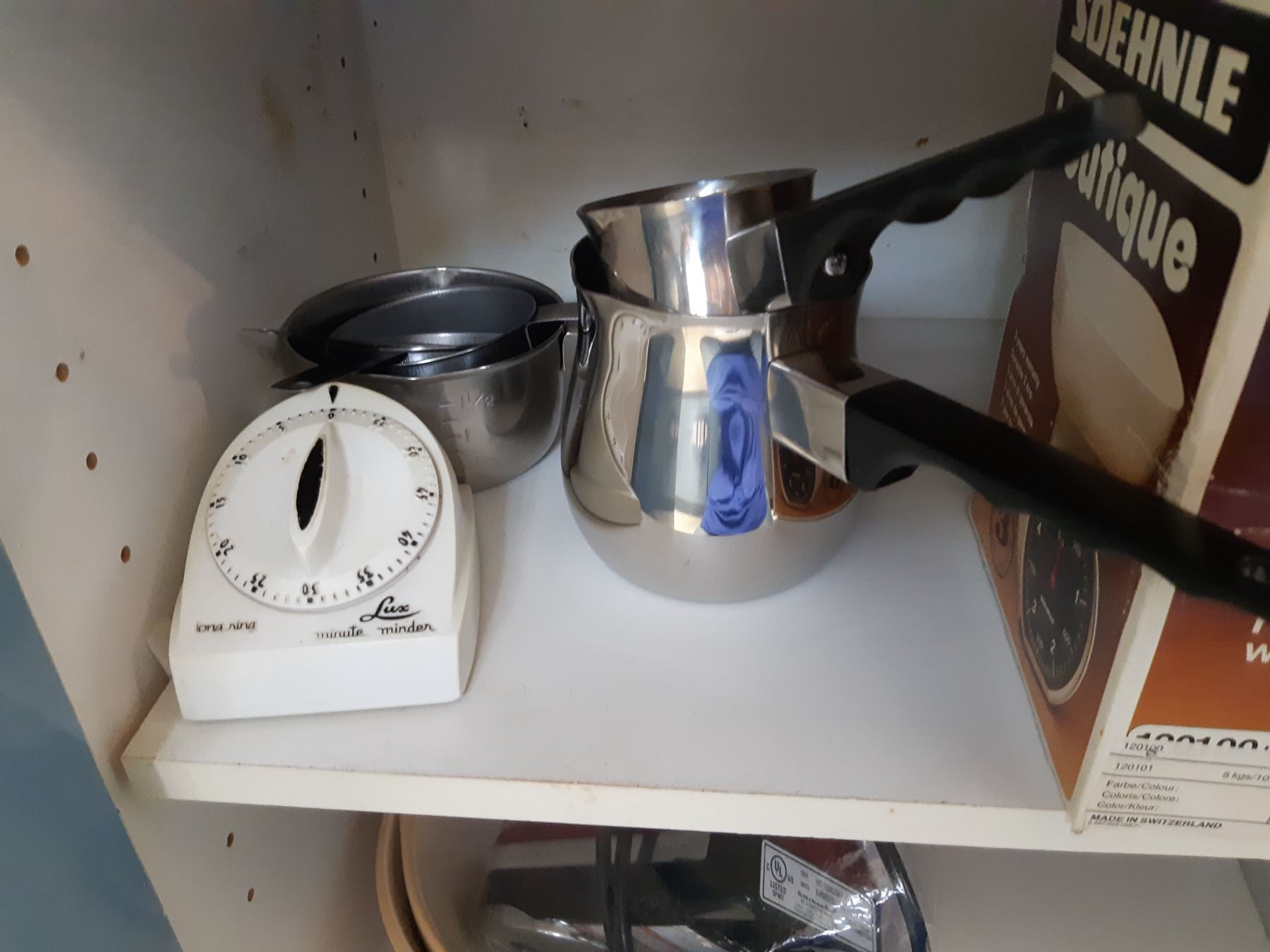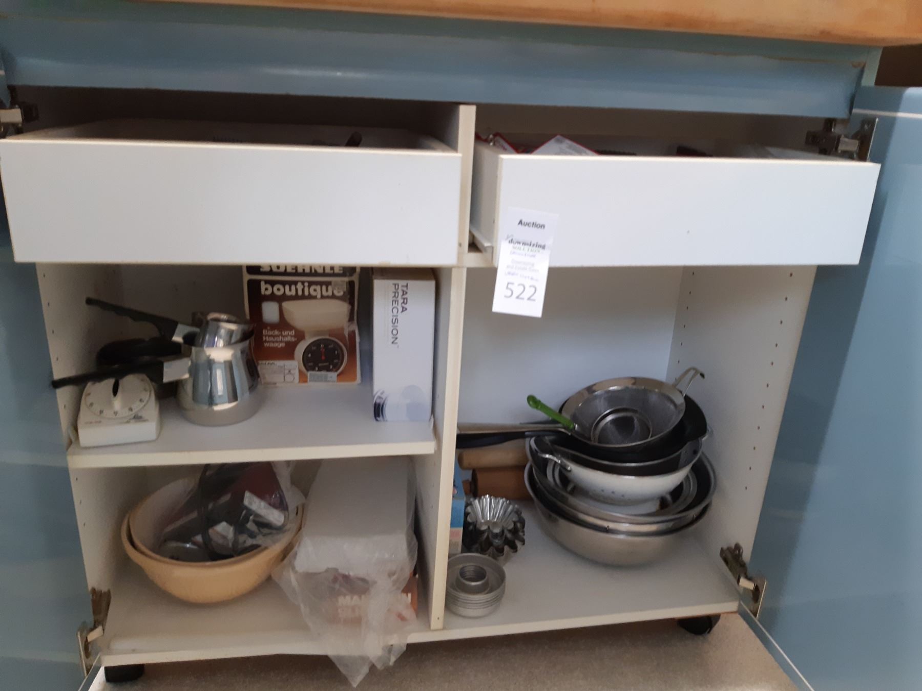 Kitchen aid hand mixer, scales, stainless steel milk warmers, bowls, ceramic mixing bowls.kitchen utensils in 2 drawers above. Bring packing material and pickup at 9 am