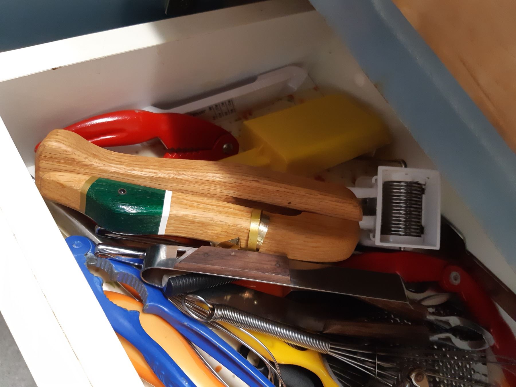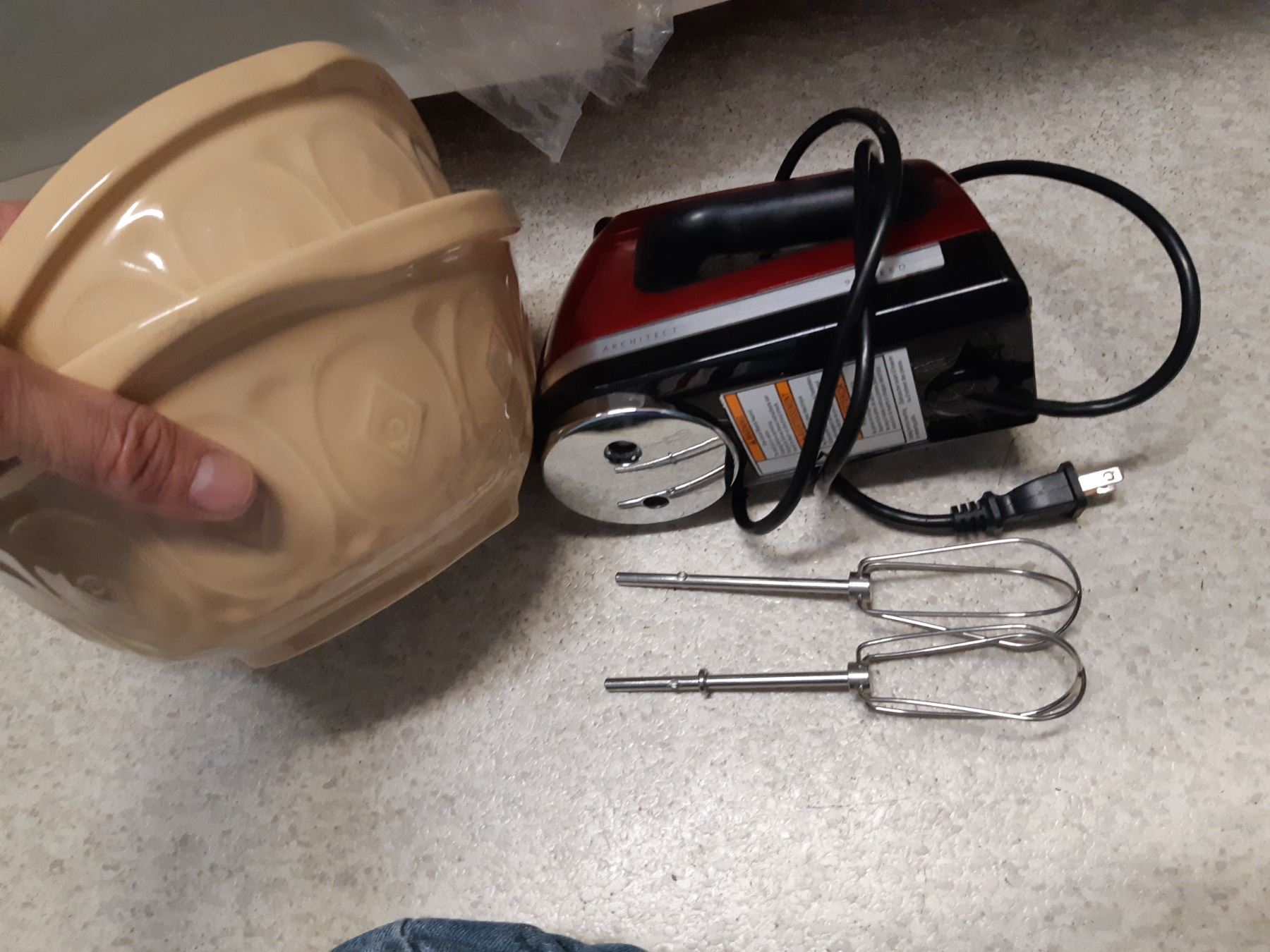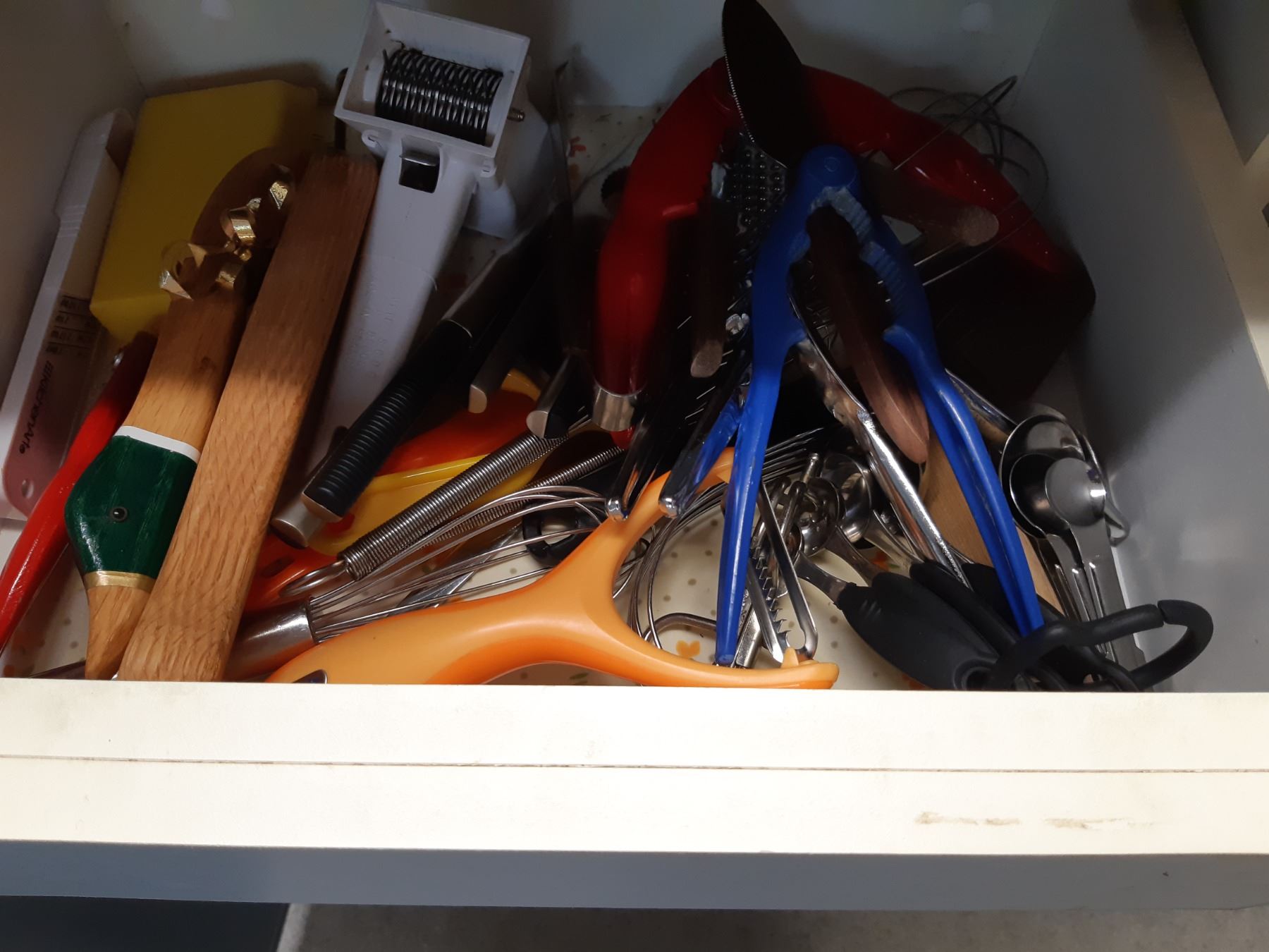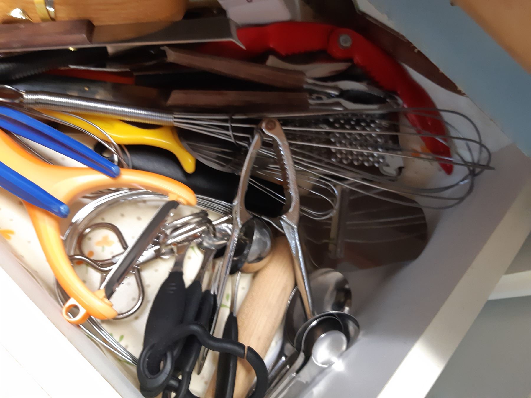 Kitchen aid hand mixer, scales, stainless steel milk warmers, bowls, ceramic mixing bowls.kitchen utensils in 2 drawers above. Bring packing material and pickup at 9 am