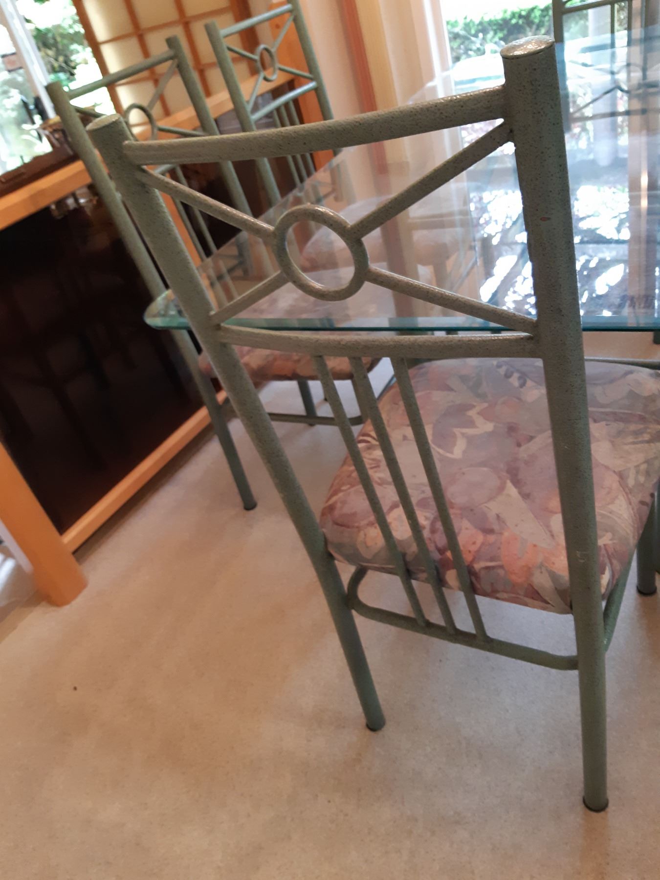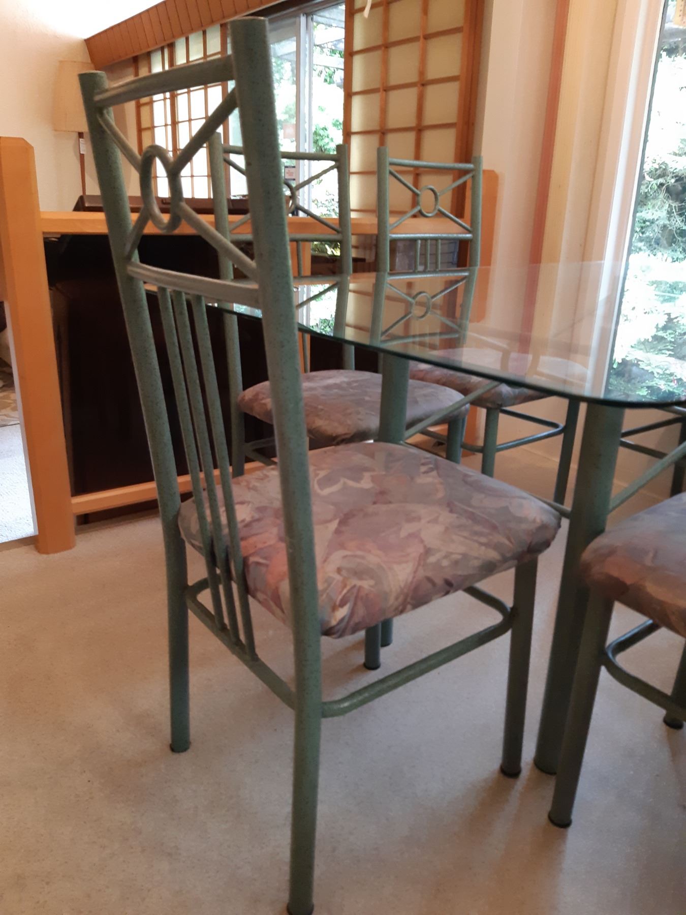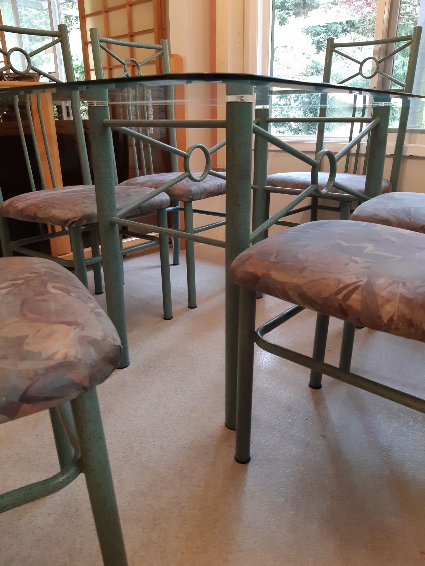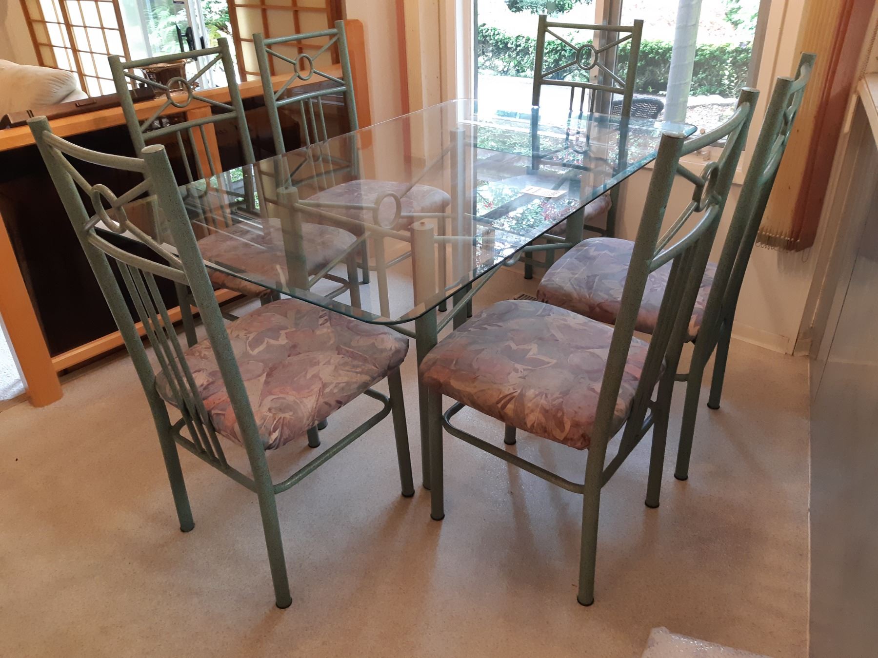 Glass top table on metal base. 60x36x29. Metal chairs with fabric seats 18x18x40 (x 6) Pickup at 12:30 pm