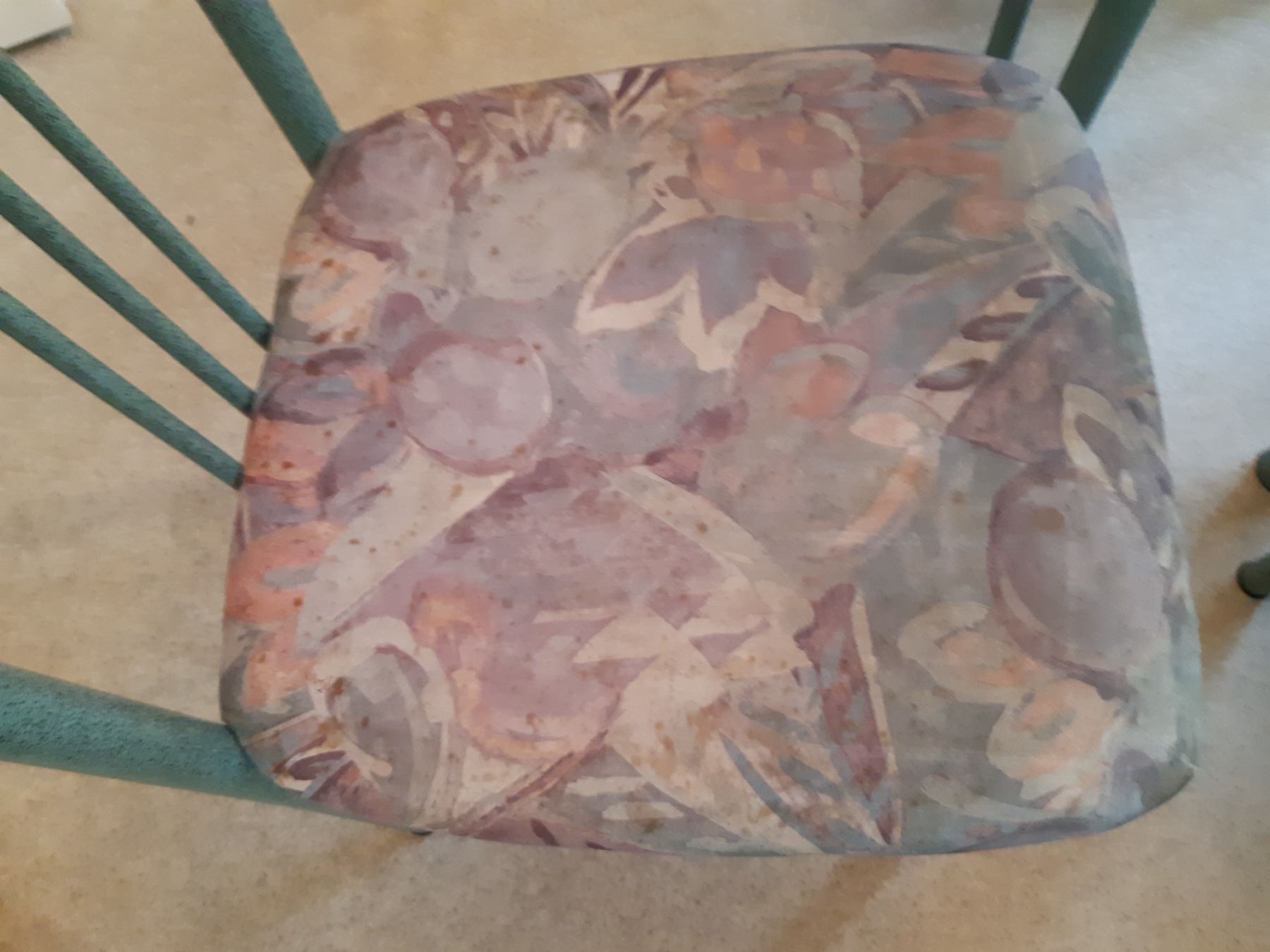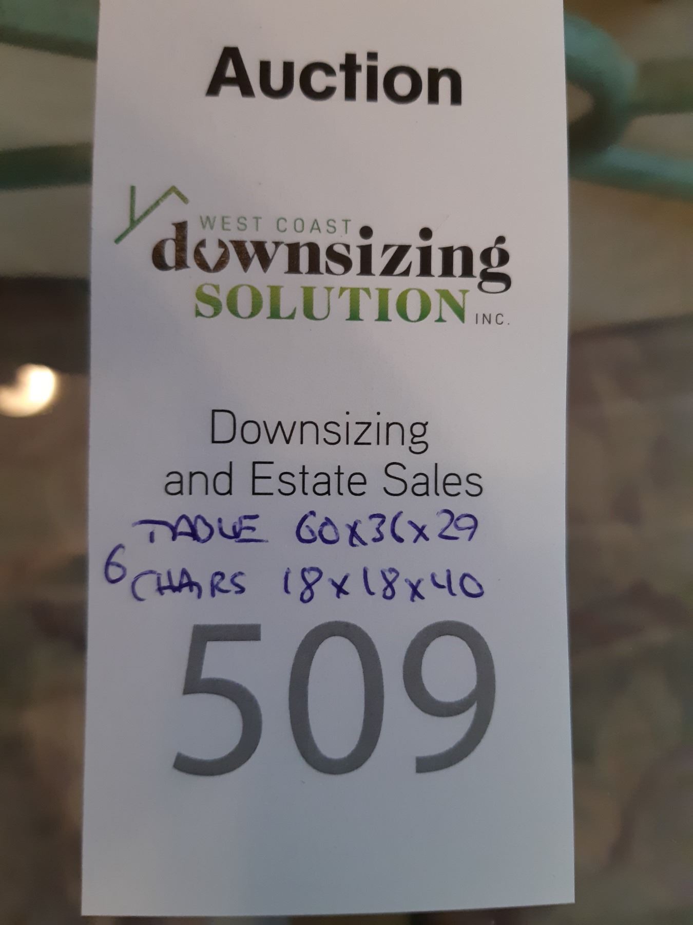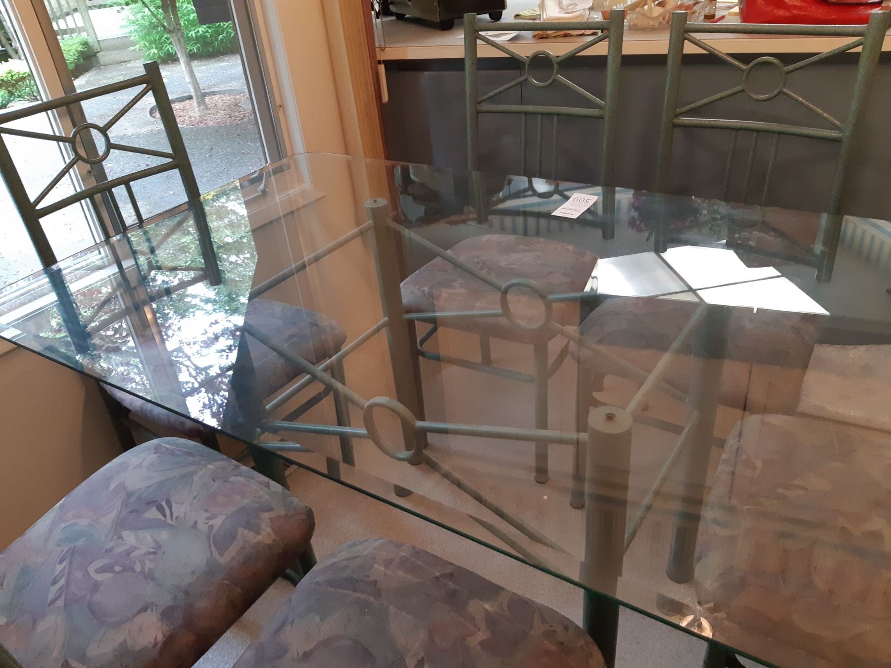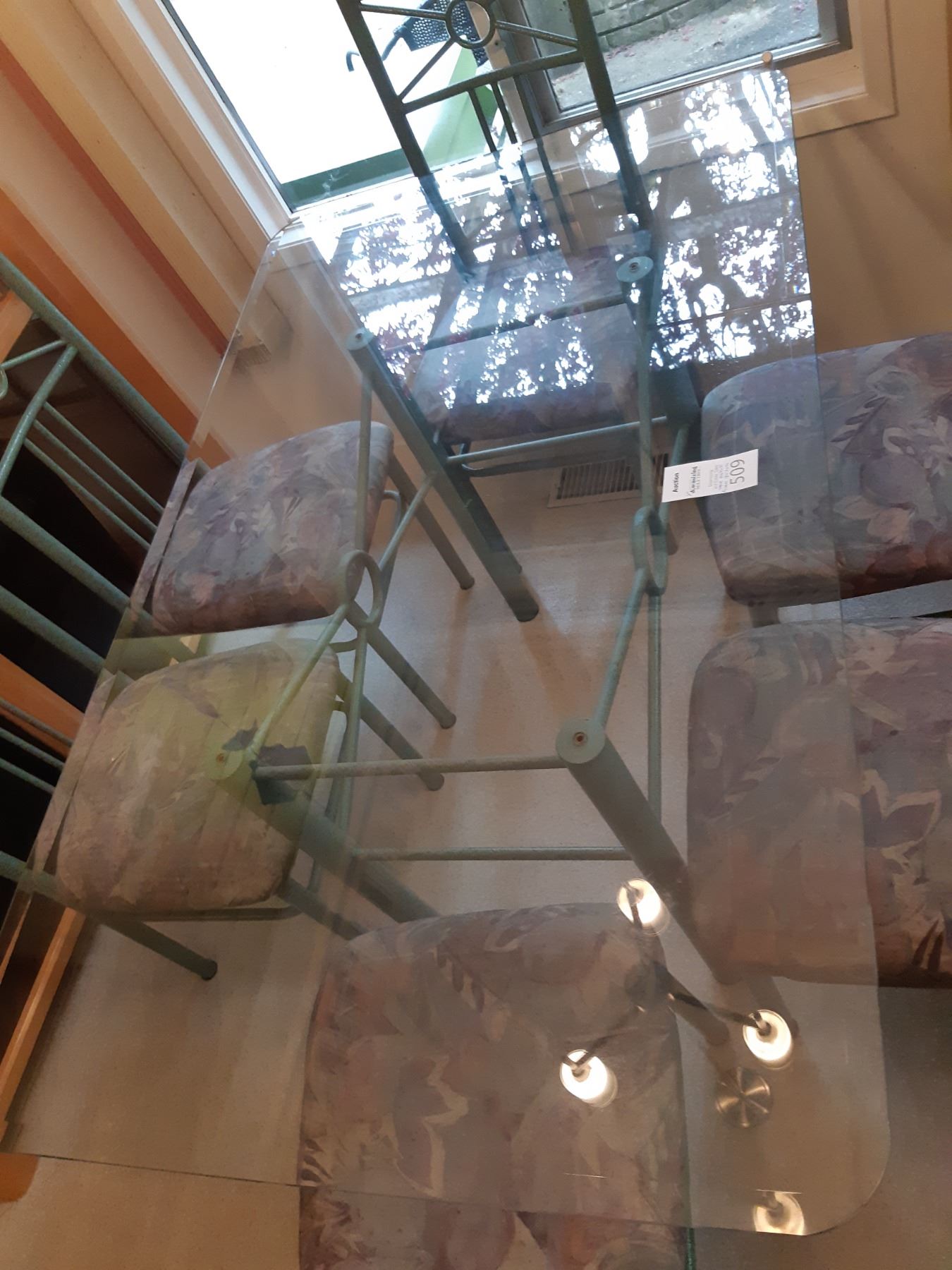 Glass top table on metal base. 60x36x29. Metal chairs with fabric seats 18x18x40 (x 6) Pickup at 12:30 pm