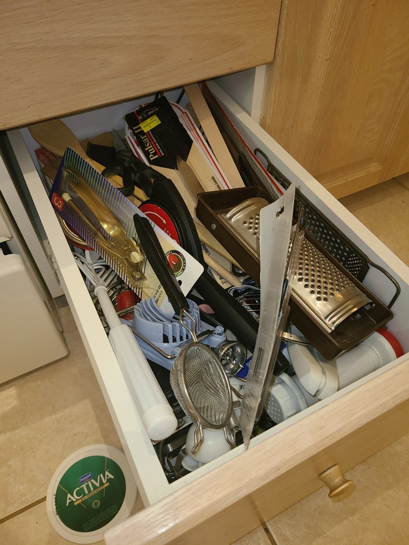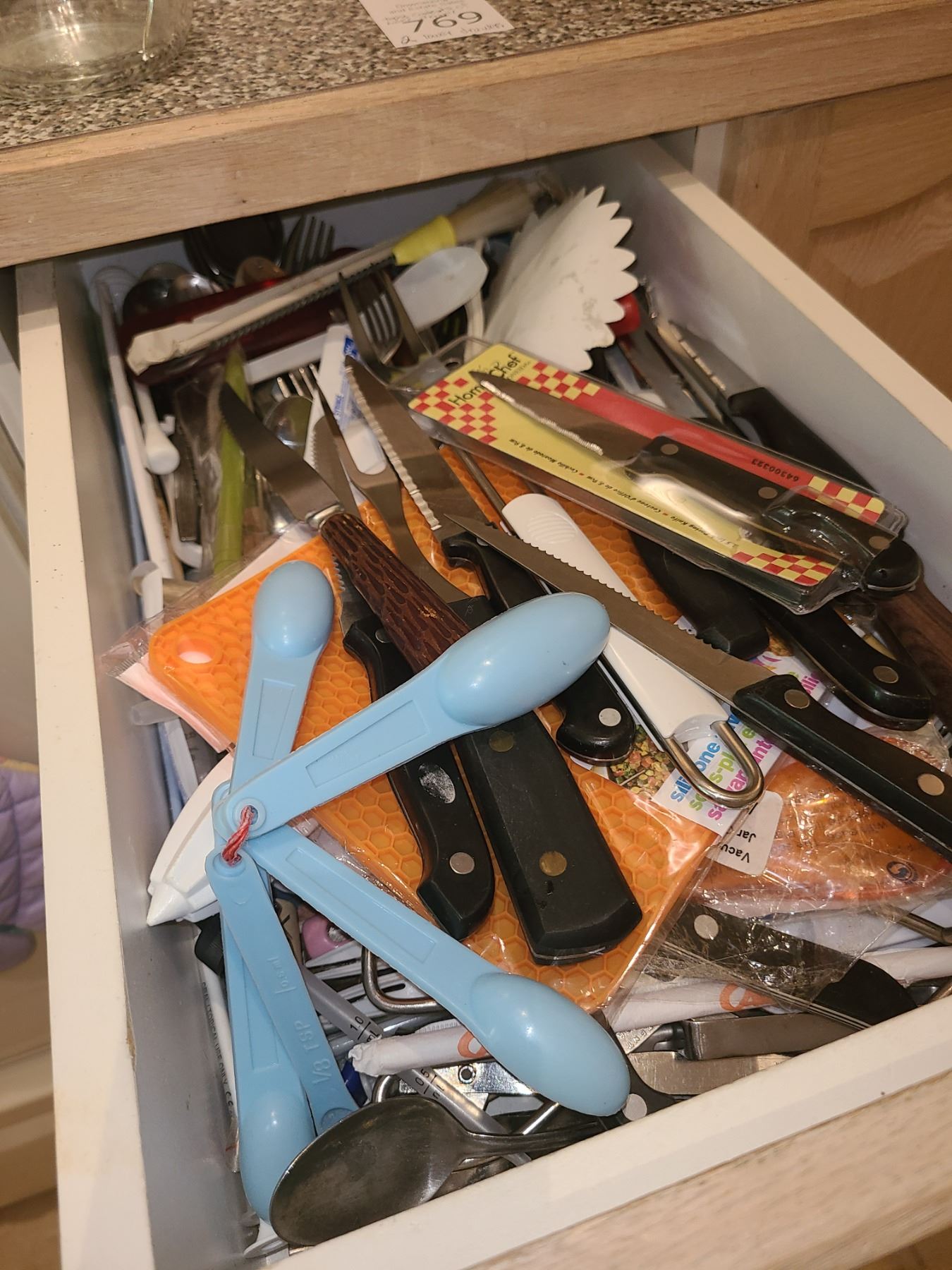 Lot of kitchenware and contents of drawer including unopened items. Bring packing material. Pickup 9am.