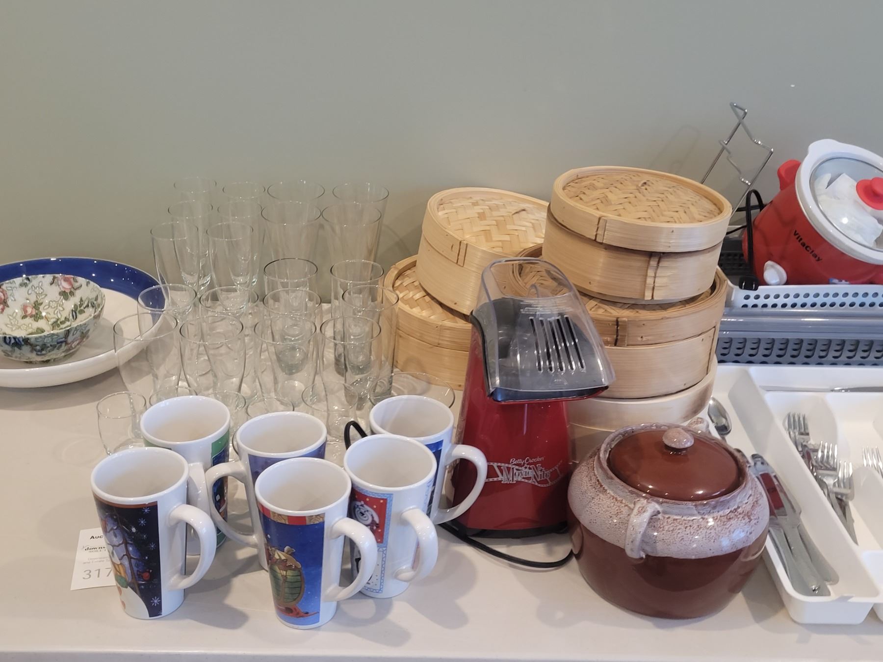 Bamboo steamers, bean pot, mugs, glass and stemware, Vitaclay yogurt maker, cutlery. Pick up 9-10