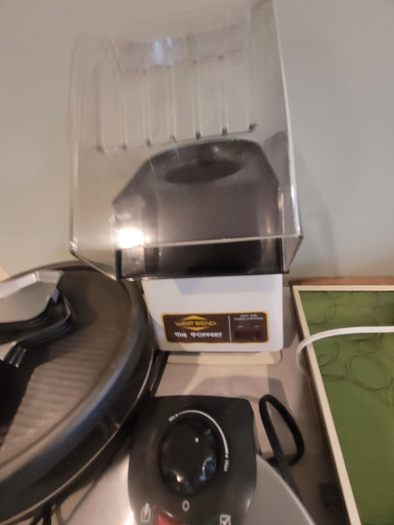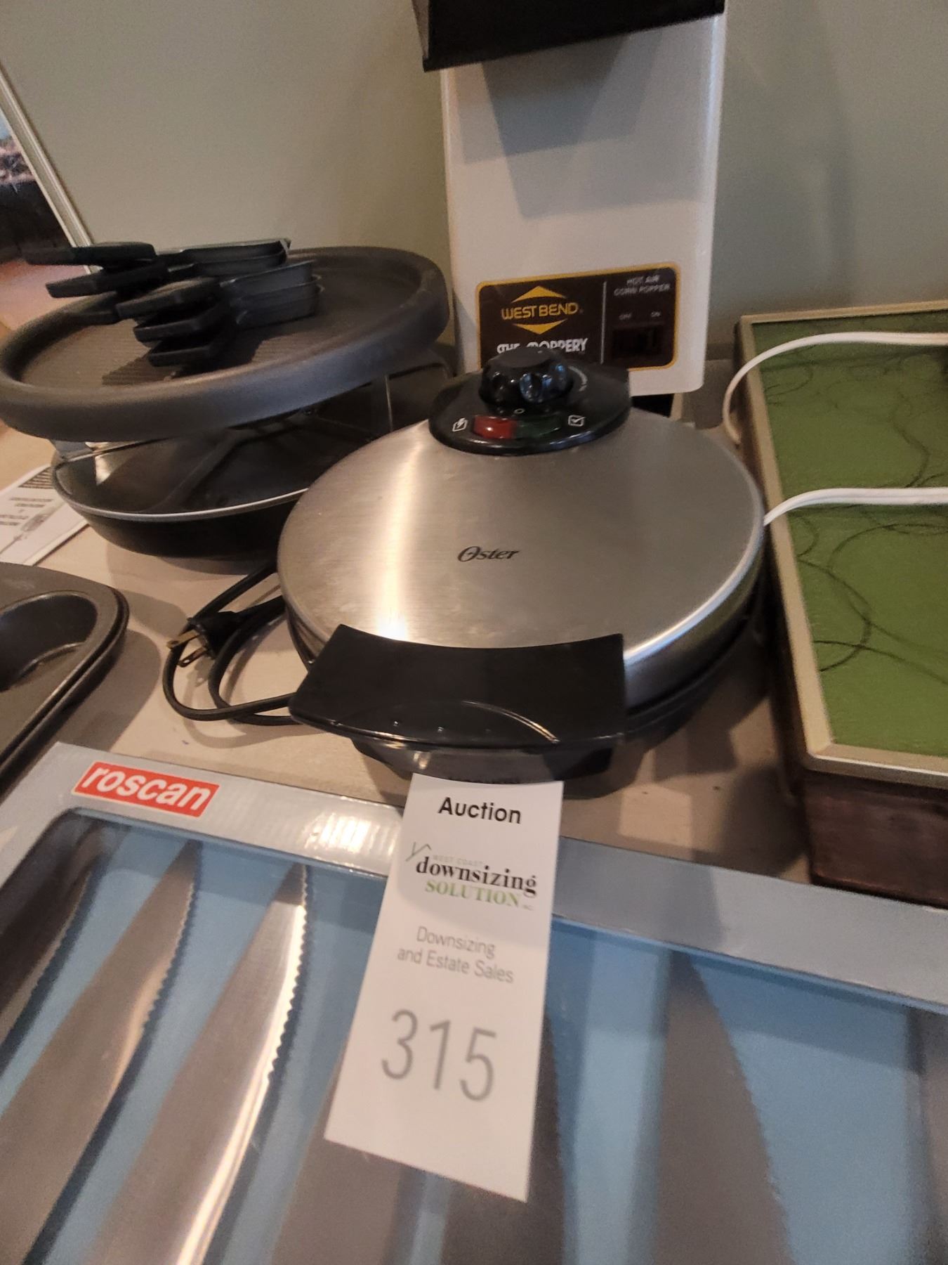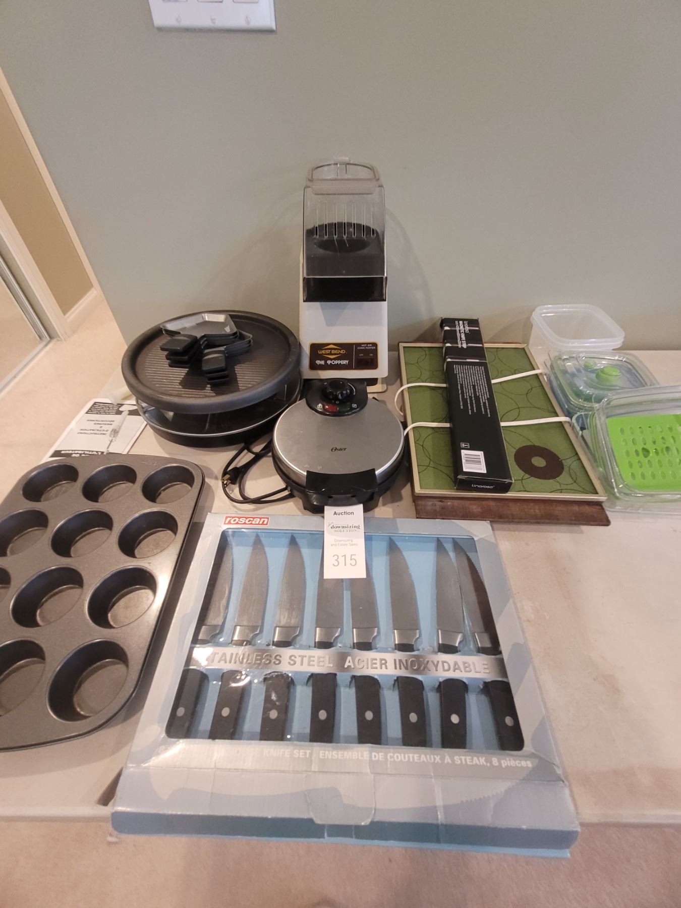 Set of 8 steak knives, magnetic knife strip, vintage electric food warmer, Popcorn maker, Oster waffle maker, more. Pick up 9-10