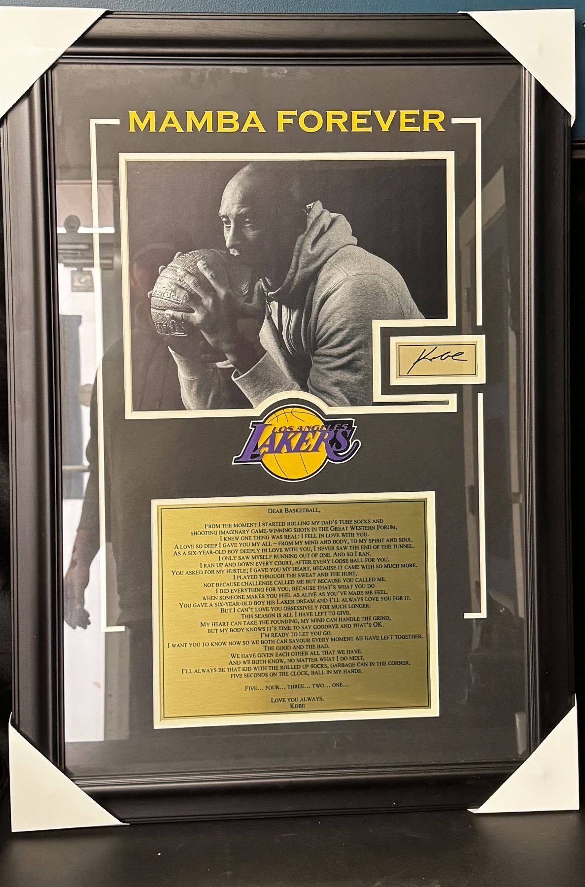 Recent listings for this piece have sky rocketed in value, Kobe memorabilia will always and forever be a trophy to own for all NBA fans alike. This was a limited production print with laser engraved quote plates and logos in a thick black quality built frame meant to last and meant to show off in your collection.