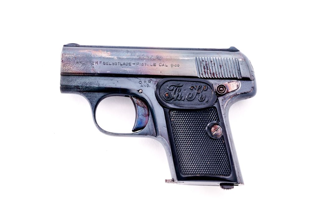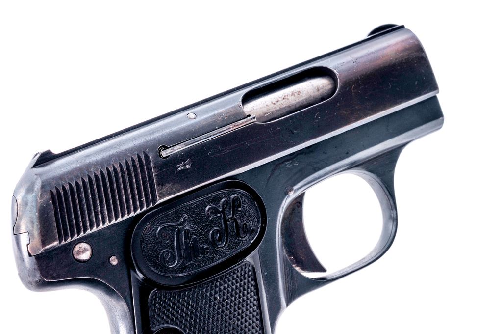 Kommer Model II Vest Pocket Semi-Automatic Pistol, NVSN, .25 Auto cal., blue finish, checkered gutta percha grips, with ''Th.K.'' logos, and one factory magazine. Top rib marked ''Th. Kommer Waffenfabrik Zella Mehlis II''. Condition is good with some added finish over pitting to forward portion of slide. Grips with moderate wear. Action needs minor work as firing pin does not consistently drop when trigger is pull. Bore is good. Est.: $200-$400. (C&R/PPT)