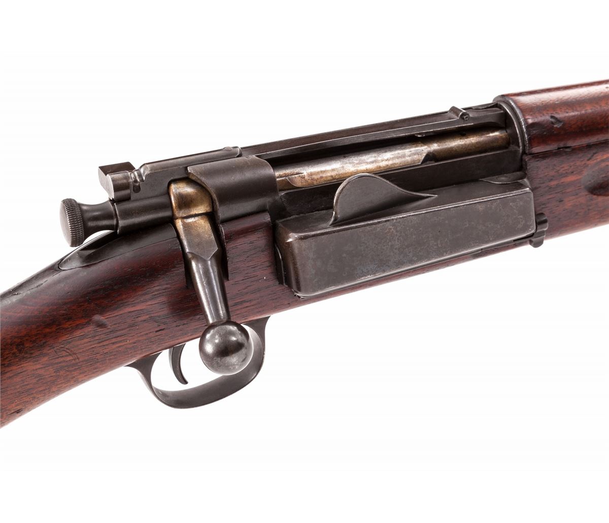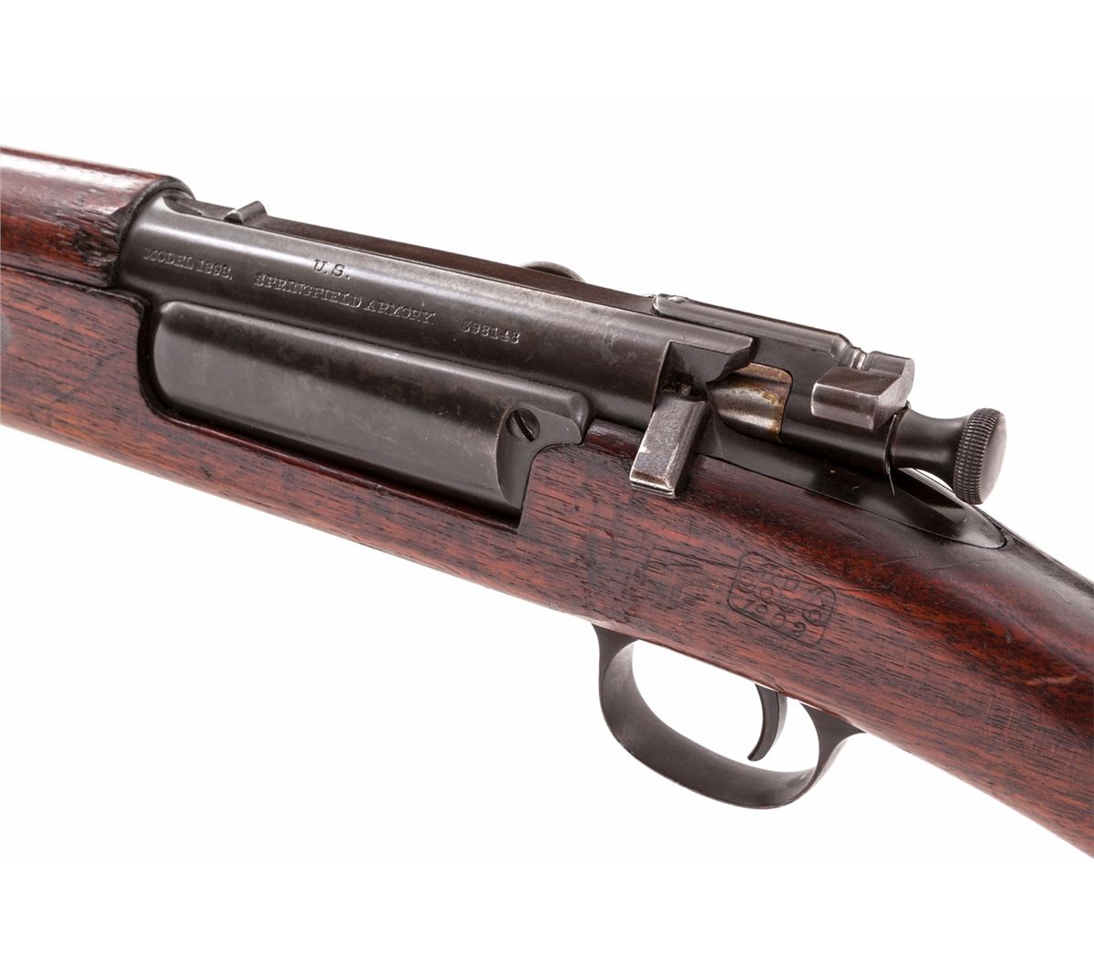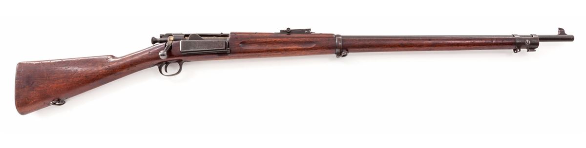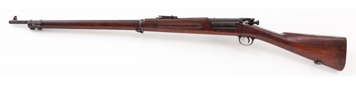 Krag Model 1898 Bolt Action Rifle, #398148, .30-40 cal., 30'' barrel, blue finish, 1902 cartouched walnut stock. Condition is fine retaining approx. 92% thinning and toning blue. Stock with scuffs and scratches. Action is good, bore is bright. Est.: $1,000-$1,500. (C&R)