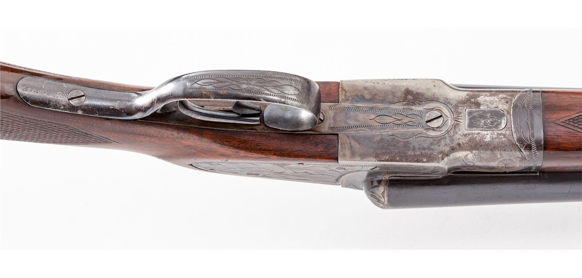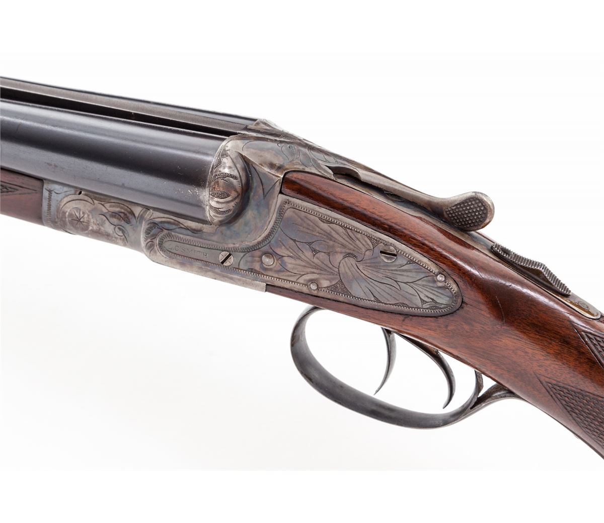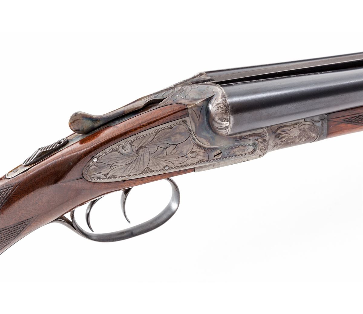 L.C. Smith Ideal Grade Side-by-Side Shotgun, by Hunter Arms, #76919, 12 ga., 30'' game rib barrels choked Full/Mod., blue finish, lightly engraved case hardened frame and sidelocks, double triggers, auto safety, extractors only, checkered pistol-grip walnut stock and splinter forend, with one white bead. Condition is excellent retaining approx. 95% blue to barrels and case hardened frame, with very minor discoloration at balance point. Stock and forend show just minor flattening to checks. Very small loss to toe of original buttplate. Good action, bright bores. Est.: $1,200-$1,800. (C&R)