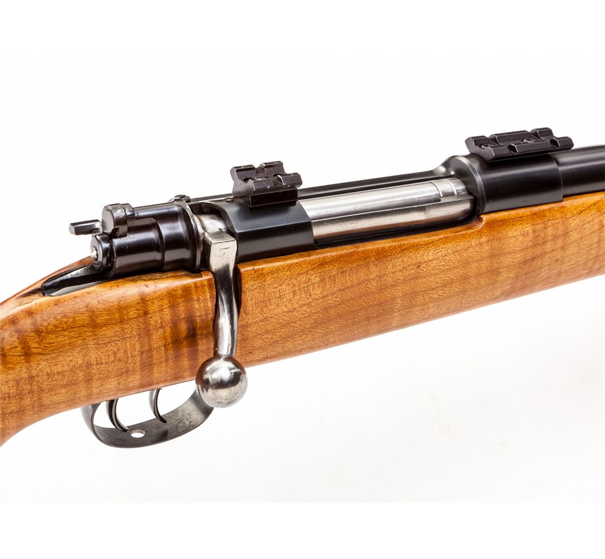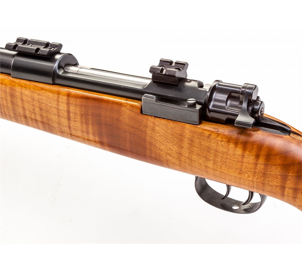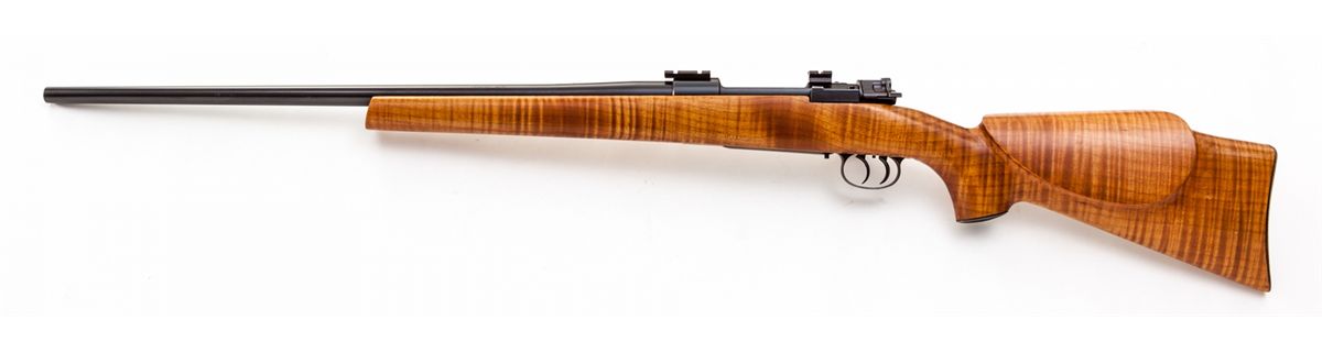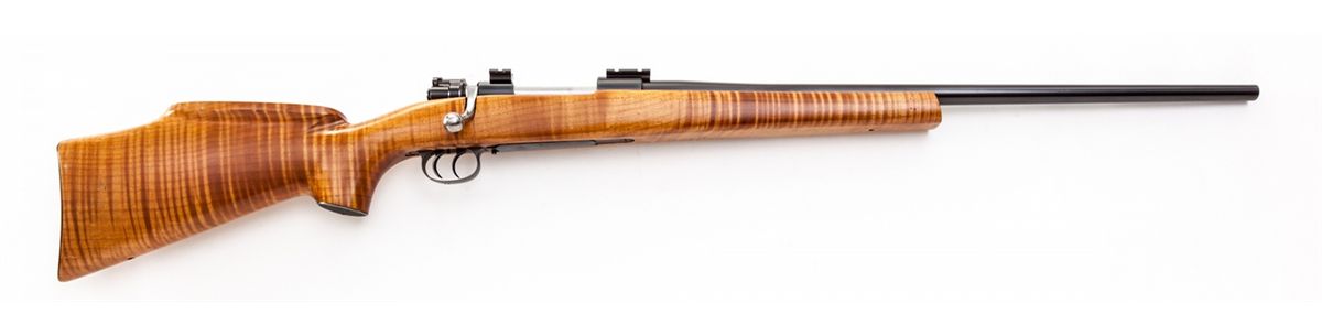 Custom Mauser Bolt Action Rifle, by L.R. Wallack, #2925283, .243 cal., 24'' barrel, blue finish, smooth fancy pistol-grip cheekpiece tiger-striped maple stock, with checkered steel buttpate and pistol-grip cap, double set trigger, polished bolt with turned-down handle, and Weaver mounts. Condition is excellent as custom constructed, with just light scuffs to stock from handling. Drilled for sling swivels. Action is crisp, adjustable set trigger functions as designed, bore is fair. Est.: $500-$750. (Modern)