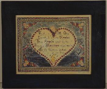 , American, 20th C., framed lithographic "Frakfur" in colour with the following legend: "Hush, my dear, Lie still in slumber, Holy angels guard thy bed, Heavenly blessings without number, Gently falling on thy head." Isaac Watts, image 6 ¾"x8 ¾", signed and dated lower left & right, Landis-Eigsti, 1994, #39/200.