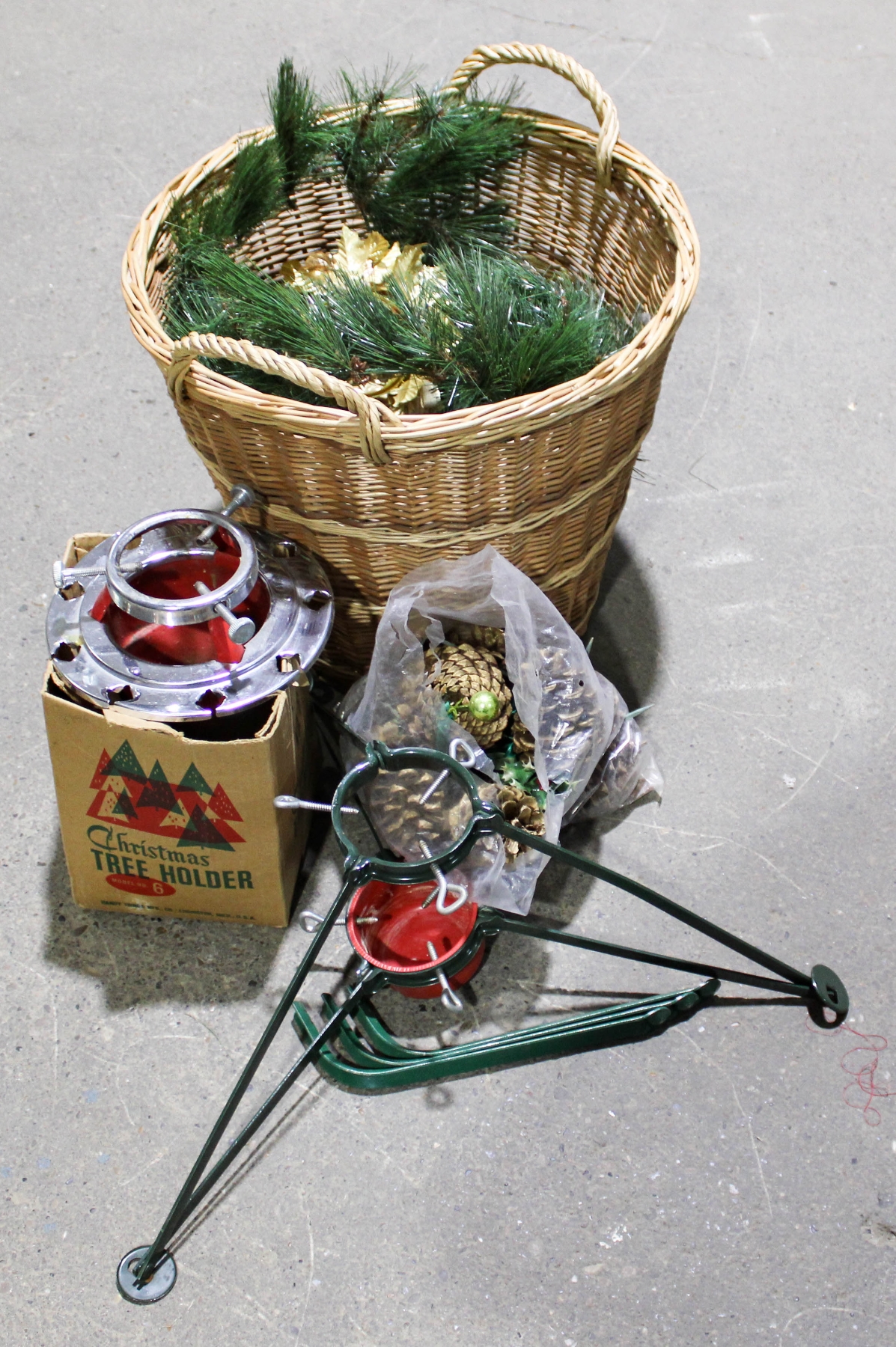 LARGE BASKET W/ 2 CHRISTMAS TREE STANDS / DECORATIONS