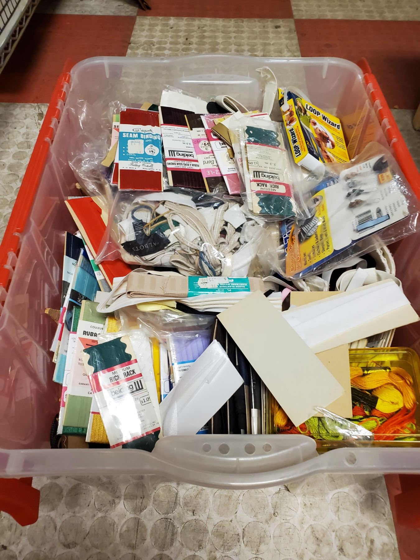 LARGE BIN OF SEWING NOTIONS AND PATTERNS