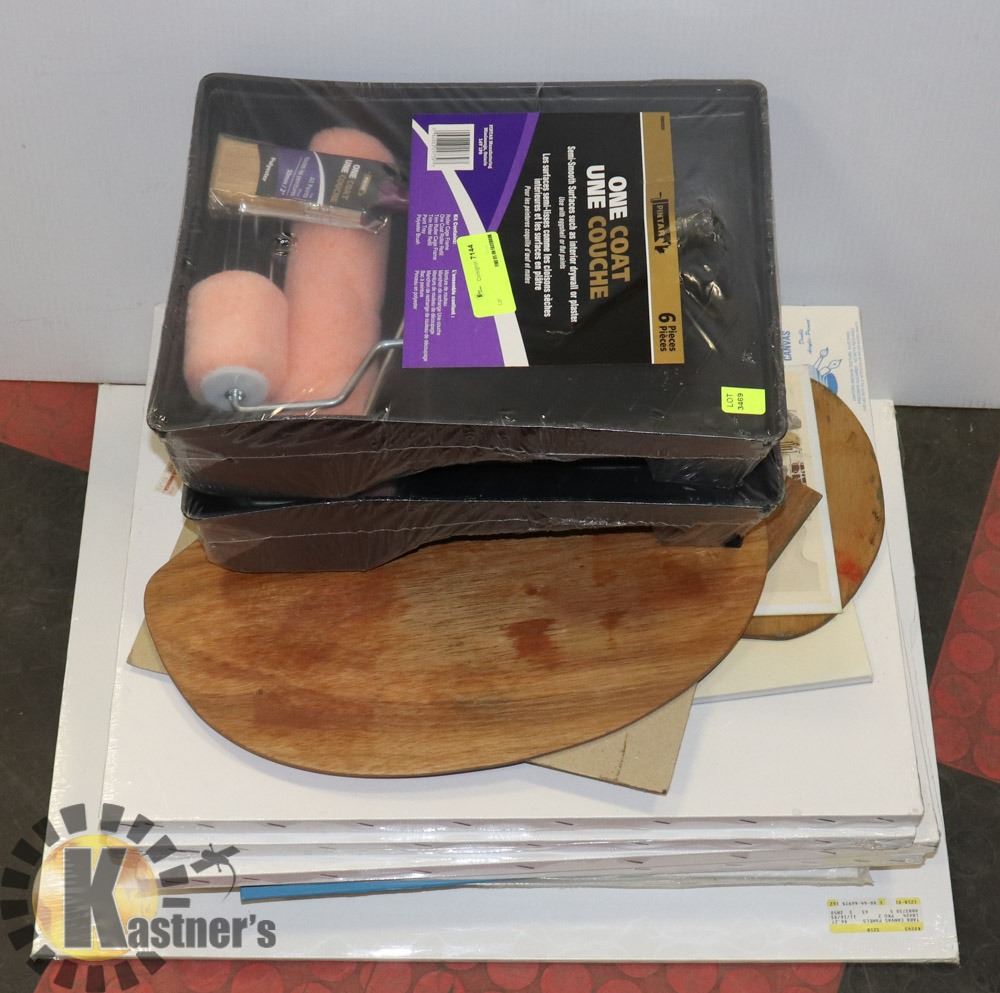 LARGE BUNDLE OF PAINTING SUPPLIES AND ART CANVAS