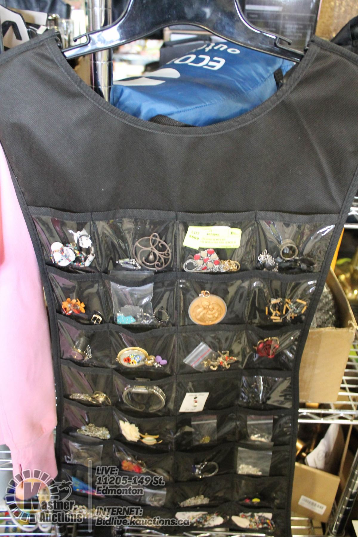 LARGE HANGING JEWELRY ORGANIZER WITH ESTATE JEWELR WATCHES, BROOCHES, RINGS, BRACELETS AND NECKLACES