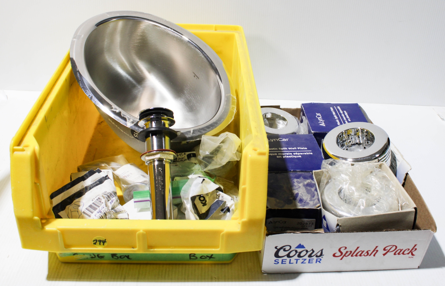 LARGE PARTS TRAY W/ SINK & PLUMBING SUPPLIES ETC