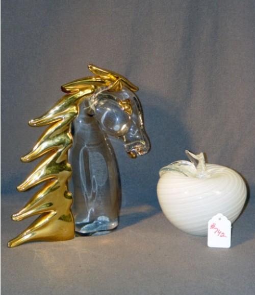 LG GLASS APPLE PAPERWEIGHT & GLASS HORSE HEAD