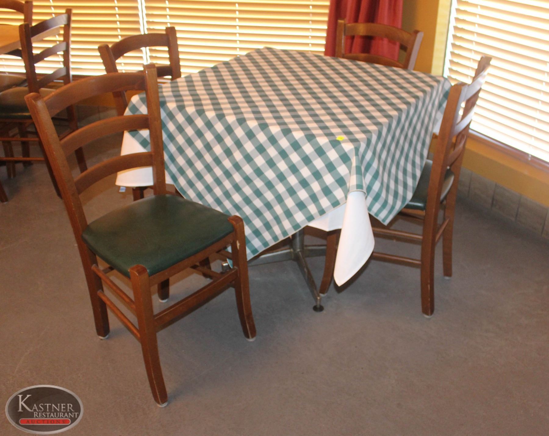 LOCATION #1. SQUARE WOODEN DINING TABLE W/ 4 WOOD & LEATHERETTE