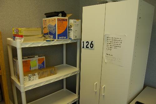 LOCKER CABINET, PLASTIC SHELF AND CONTENTS
