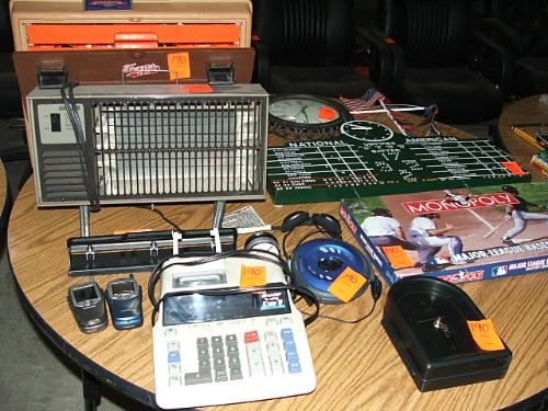 LEAGUE BASEBALL, (1) NATIONAL AMERICAN GAME BD. CLOCK, (1) DECO CLOCK/INGRAHAM, (1) PANASONIC CD PLAYER/PORT./(1) ELECTRIC HEATER, (1) FIRST AID CASE, (2) SAMSUNG CELL PHONES, (1) HOLE PUNCH, (1) BATTERY ALARM CLOCK, (1) ADDING MACHINE/SHARP, (1) DESK CLOCK.