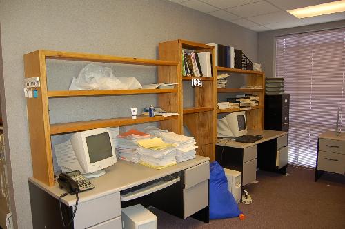LOT CONSISTING OF 2 DESK, SHELF UNIT AND CONTENTS