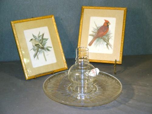 LOT GLASS PLATE AND 2 BIRD PRINTS