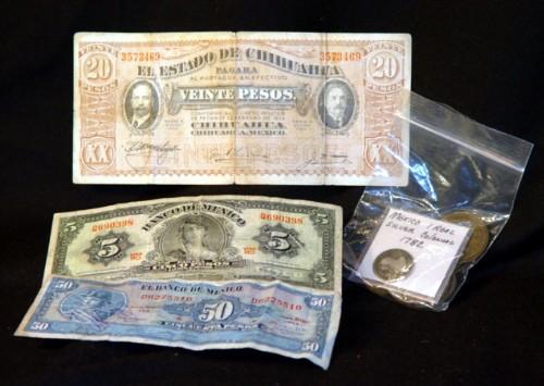 LOT MEXICAN COINS INCL 1782 REAL SILVER AND CURRENCY