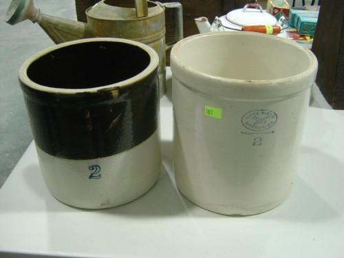 LOT OF 2 CROCKS; BROWN OVER WHITE AND WHITE CROCK WITH DAMAGE (DALLAS TEXAS)