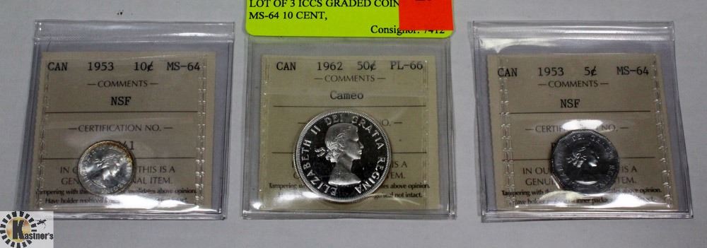LOT OF 3 ICCS GRADED COINS 1953 MS-64 10 CENT,