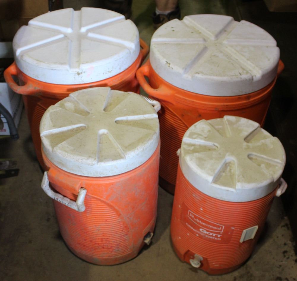 LOT OF 4 RUBBERMAID DRINK COOLERS, 1 SM, 1 MED &