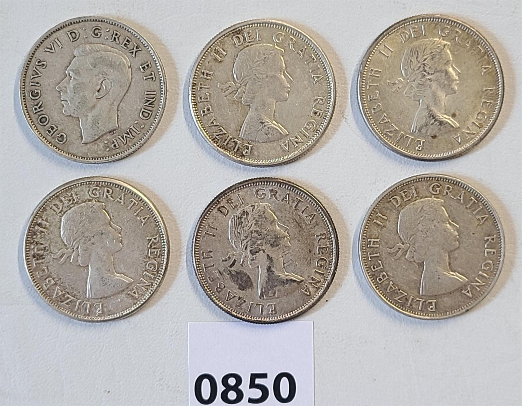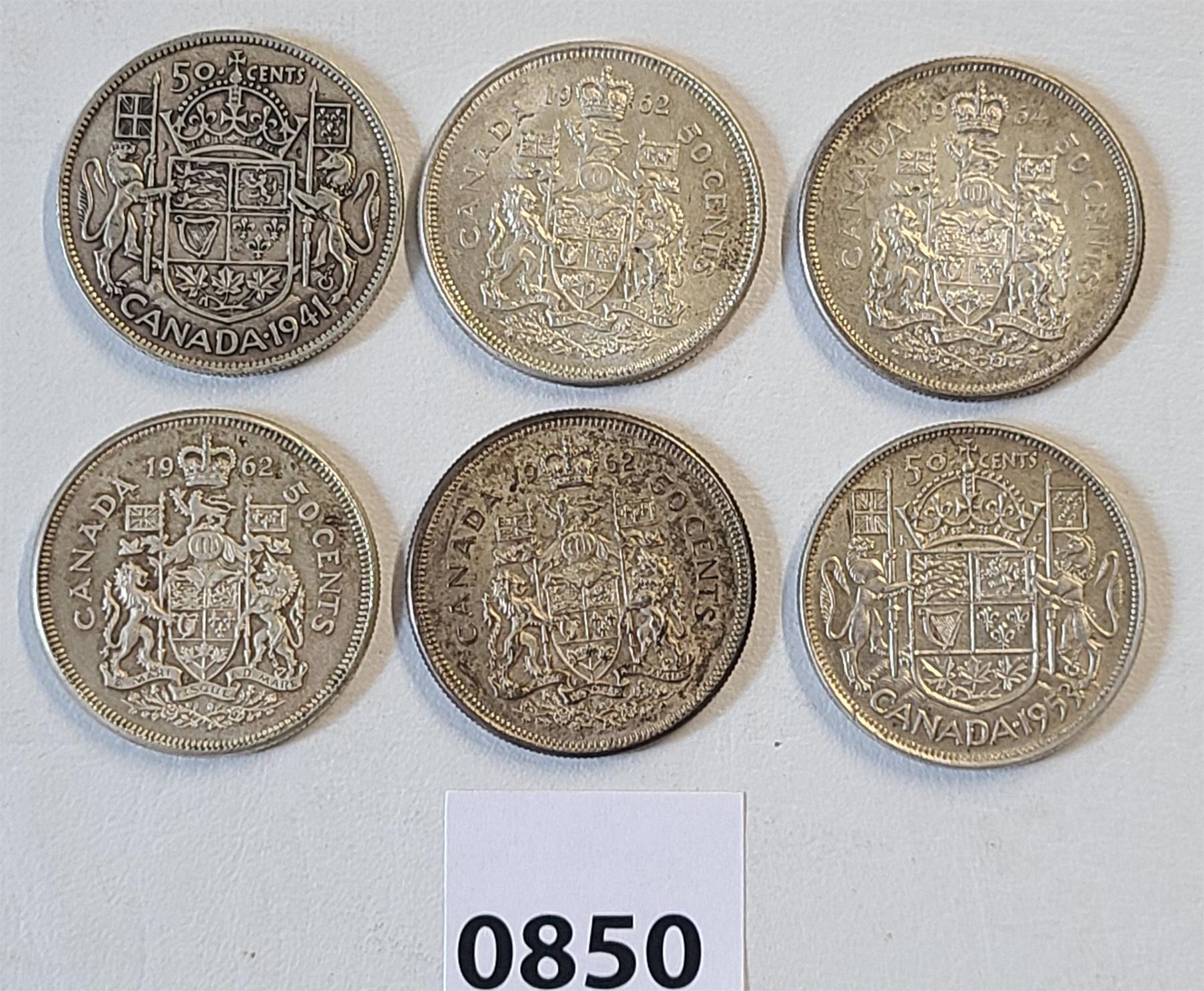 LOT OF 6 - CDN 50 CENT COINS - INCL 1941, '53, '62 & '64