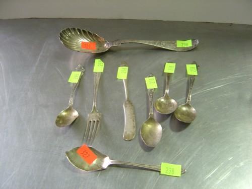 LOT OF 8 SPOONS, FORK AND BUTTER KNIFE; SOME STERLING