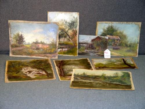 LOT OF 8 UNFRAMED 19TH C OILS ON CANVAS, INCL GAZEBO, MILL, AND RAILROAD TRACKS S/N.S.S.