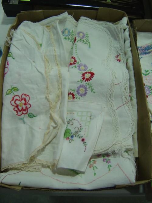 LOT OF EMBROIDERED TABLE SCARVES & DOILIES; SOME STAINS