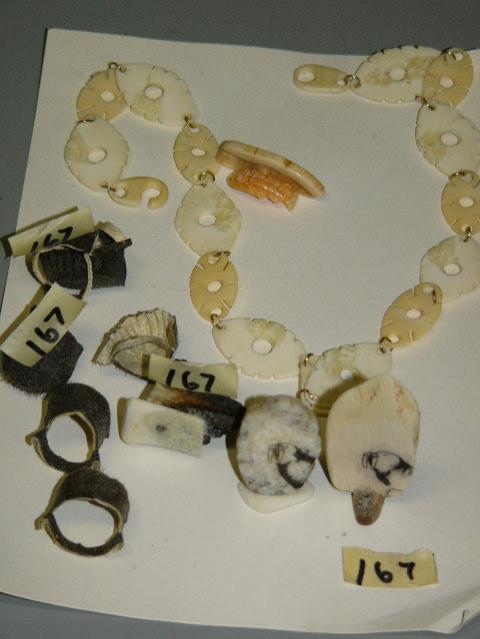 LOT of: Ivory Necklace and 3 Scrimshawed Ivory Plachets and 6 Eskimo Skin Thimbles (2)