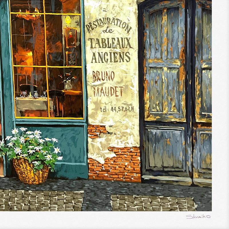"La Palette (White)" is a limited edition printer's proof serigraph on paper by Viktor Shvaiko, numbered 1/3 and hand signed by the artist. Includes Letter of Authenticity. Measures approx. 32.5" x 46" (border), 28" x 42" (image). There is minor creases in the white border area of the paper (top-left corner).
