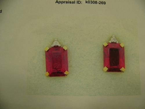 Lab-created ruby and diamond earrings 10 K yellow gold- rubies are emerald cut approx. 2.00 carats, transparent and medium red; diamonds are single cut approx. 0.02 carats- estimated replacement cost $250 (12)