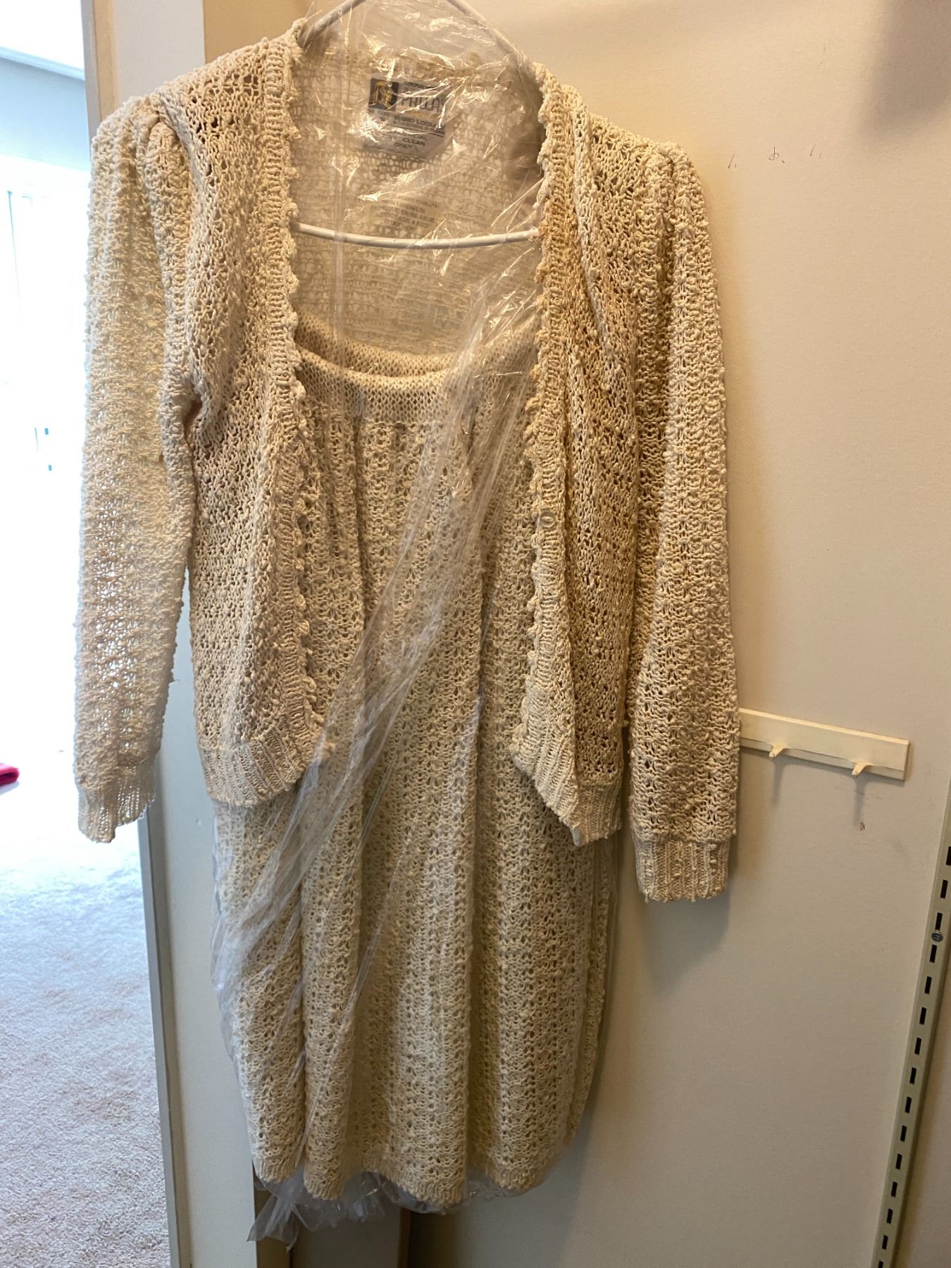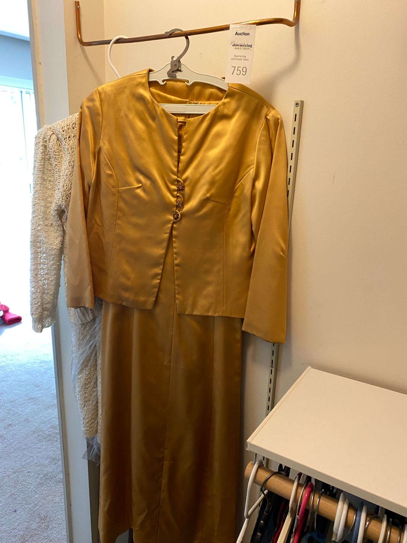 Size Small, Gold coloured evening jacket with dress. Ladies knited cardigan and skirt. Pickup at 9 am