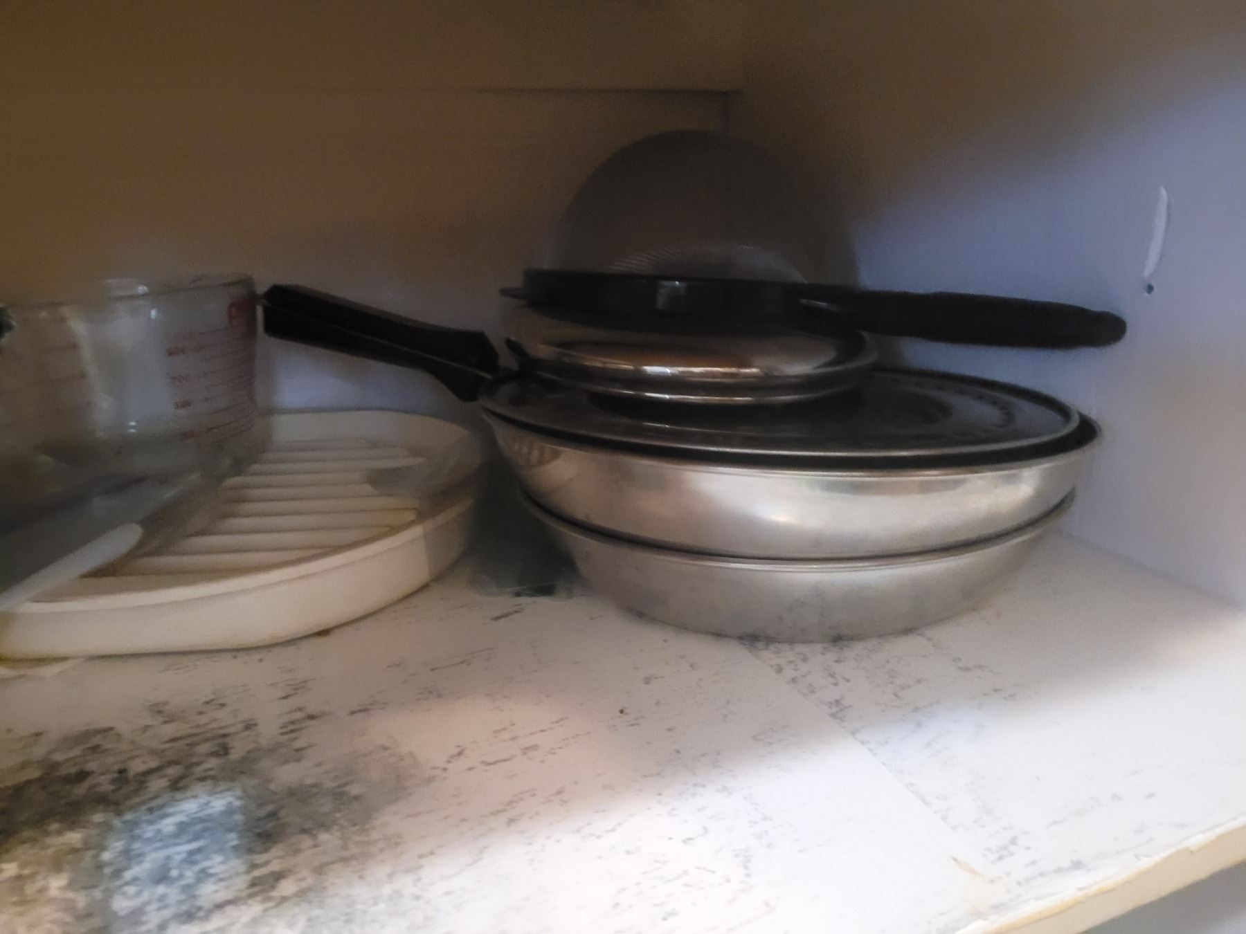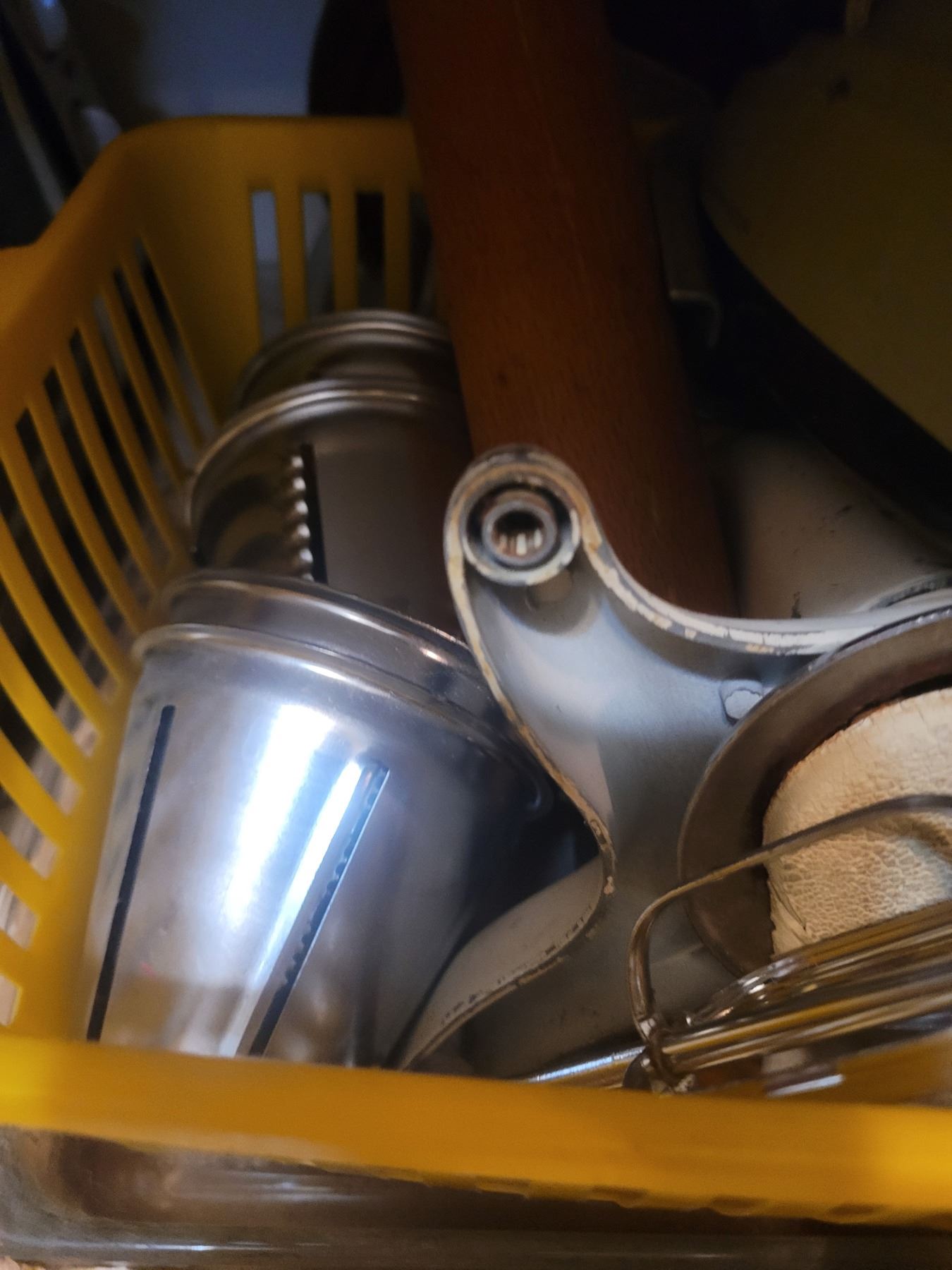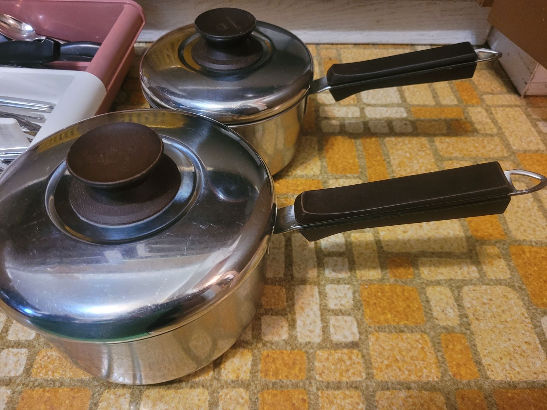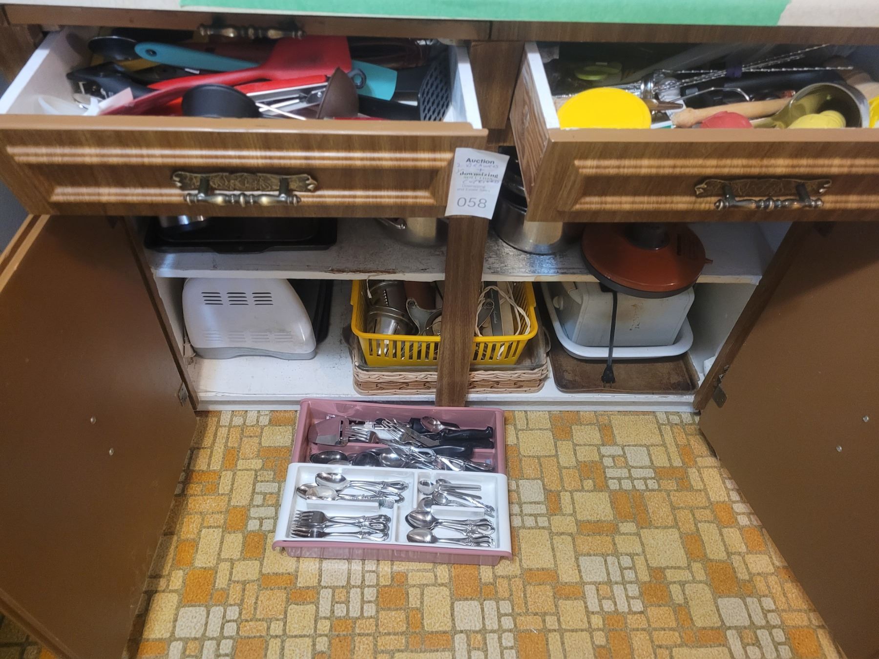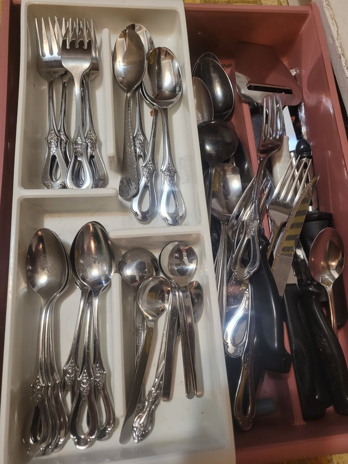 Two drawers of kitchen utensils, assorted flatware, pots, pans, toaster, Saladmaster shredder, toaster oven, more. Bring boxes. Pick up 9-10