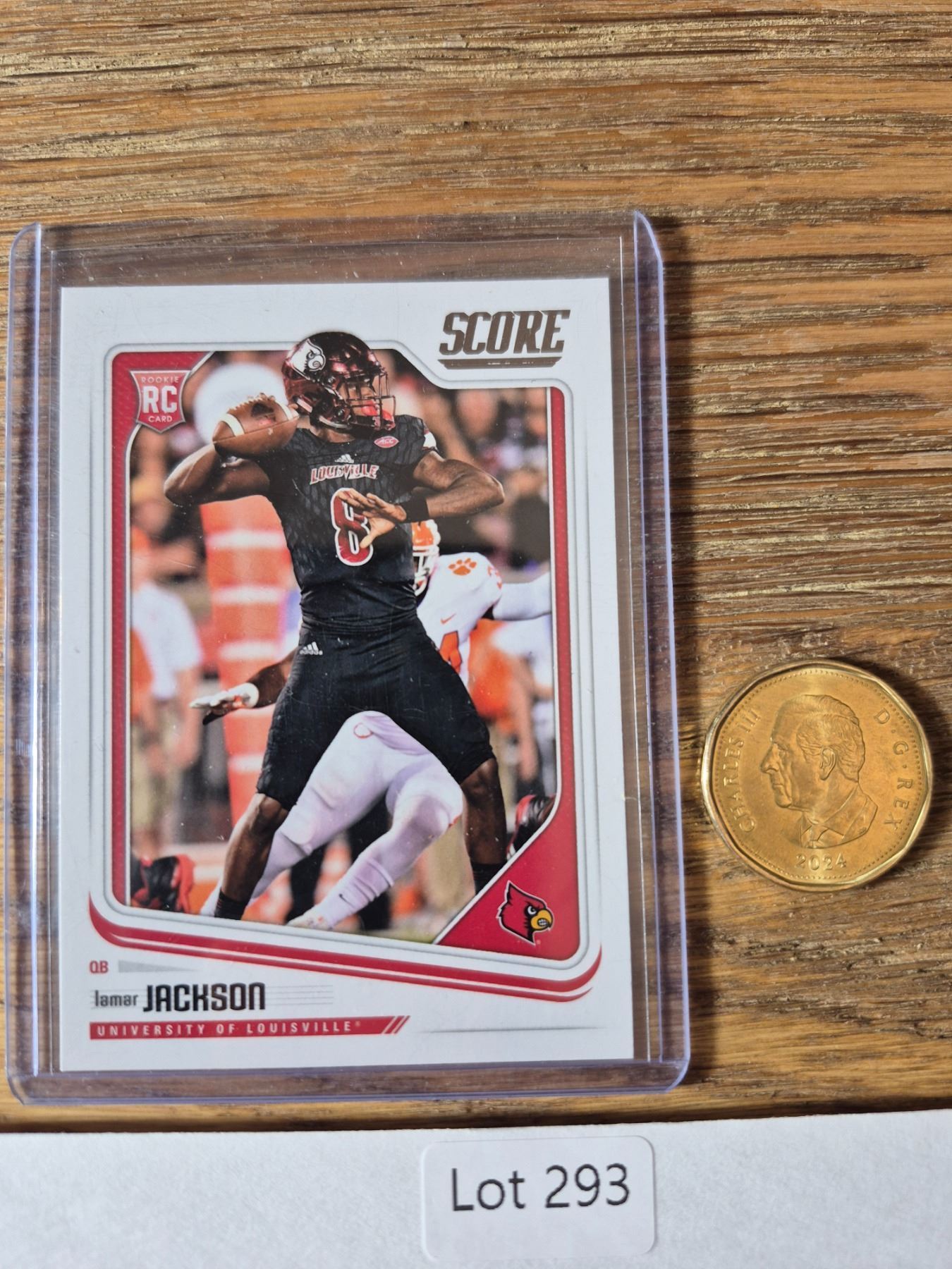 2018 Panini Score 'Draft' Rookie card featuring Lamar Jackson from the University of Louisville, issued the same year he was selected in the first round of the NFL Draft.