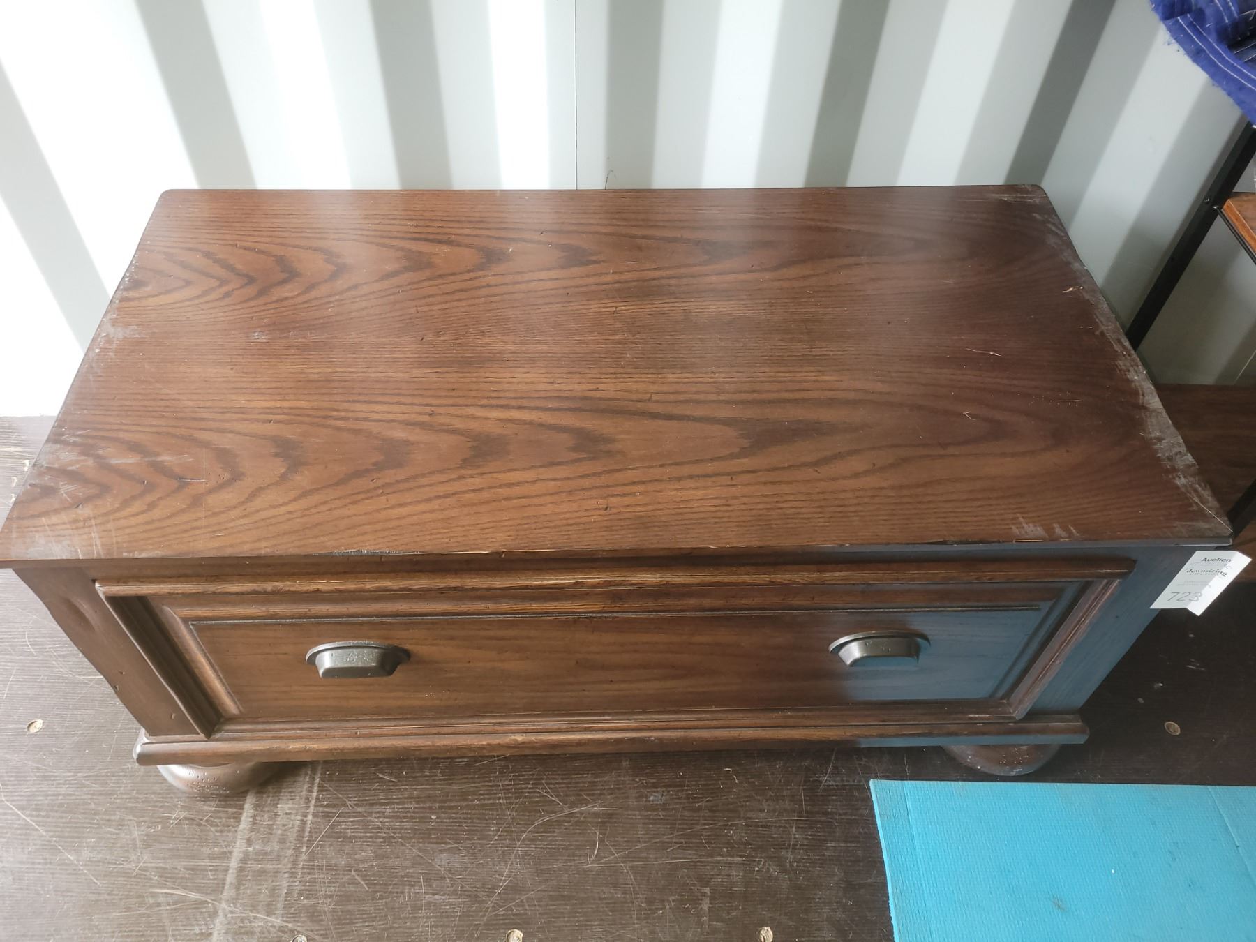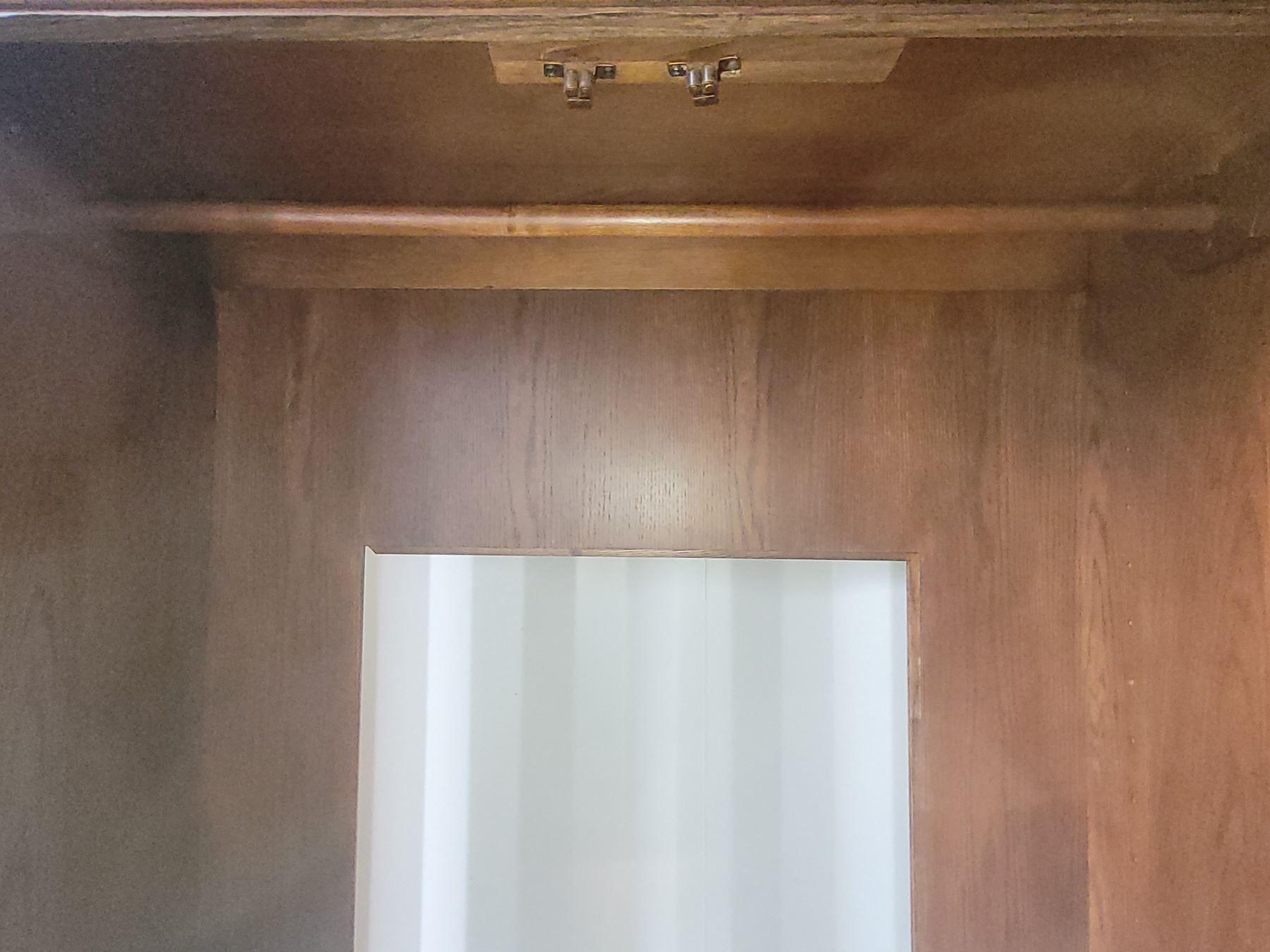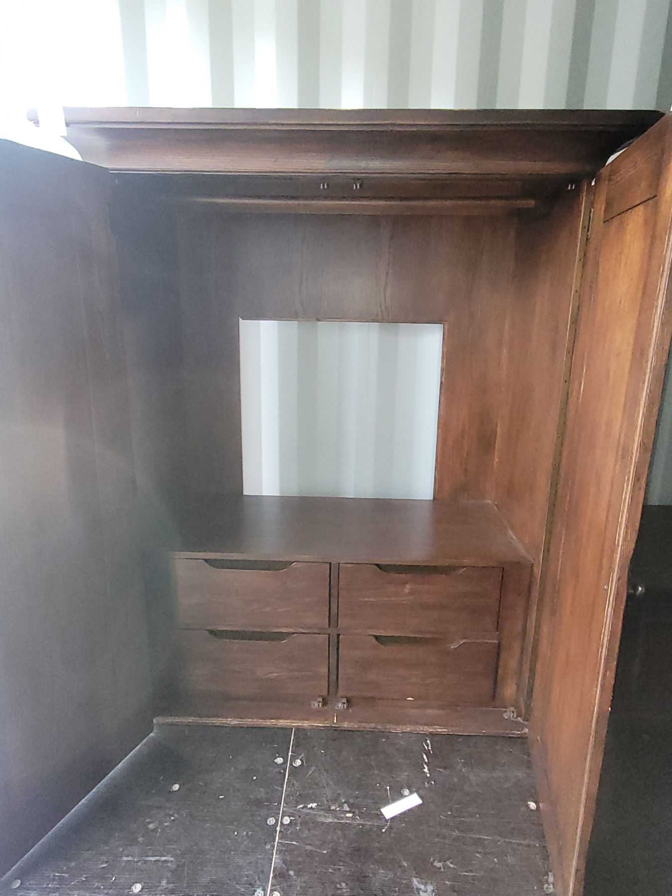 51x26x62 Wardrobe one door needs small repair, wardrobe sits on top of heavy drawer, (drawer is shown separately in images). 45x23x20. Total height of wardrobe on top of drawer is 84" note scratches Pickup 11 am