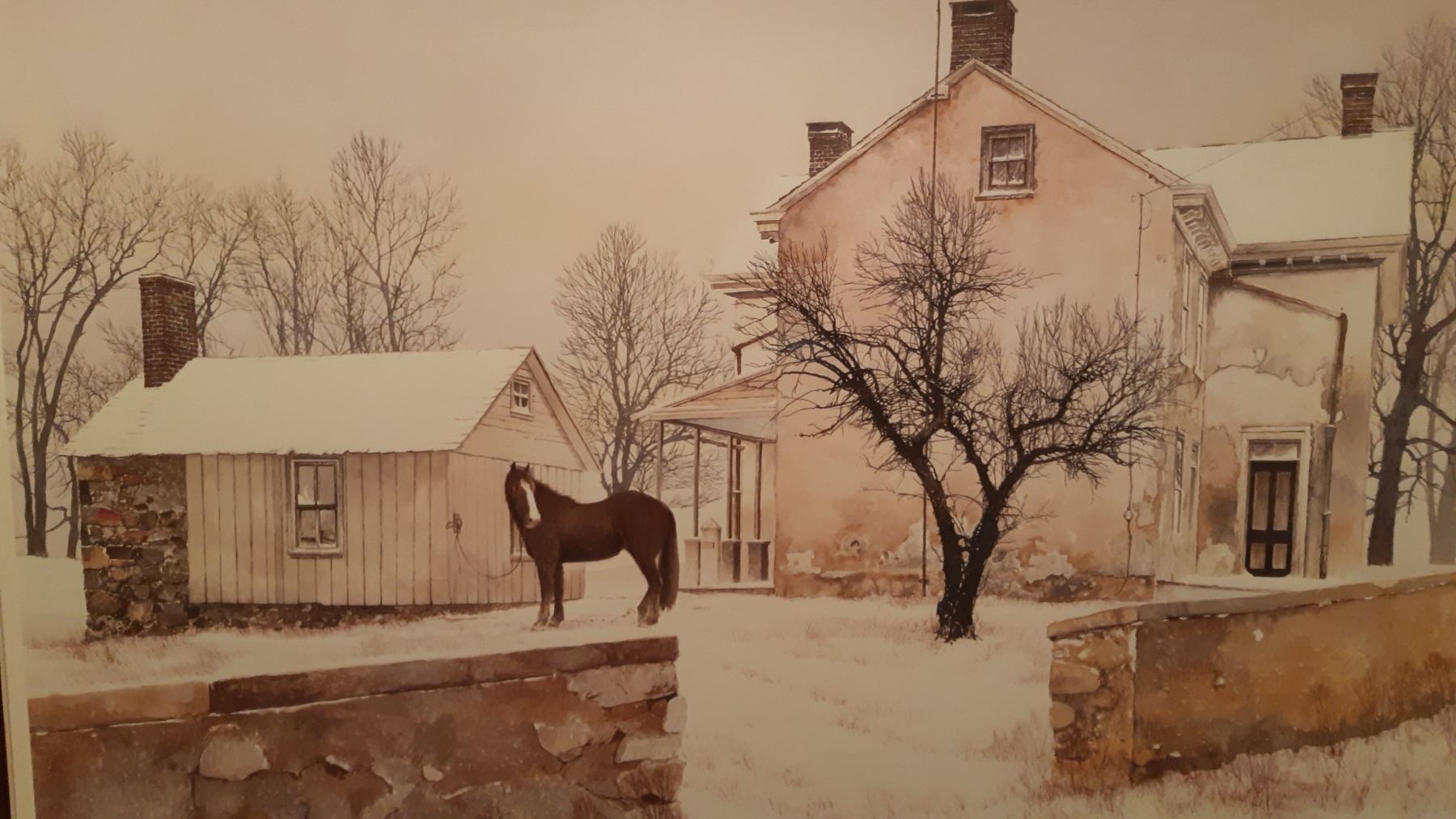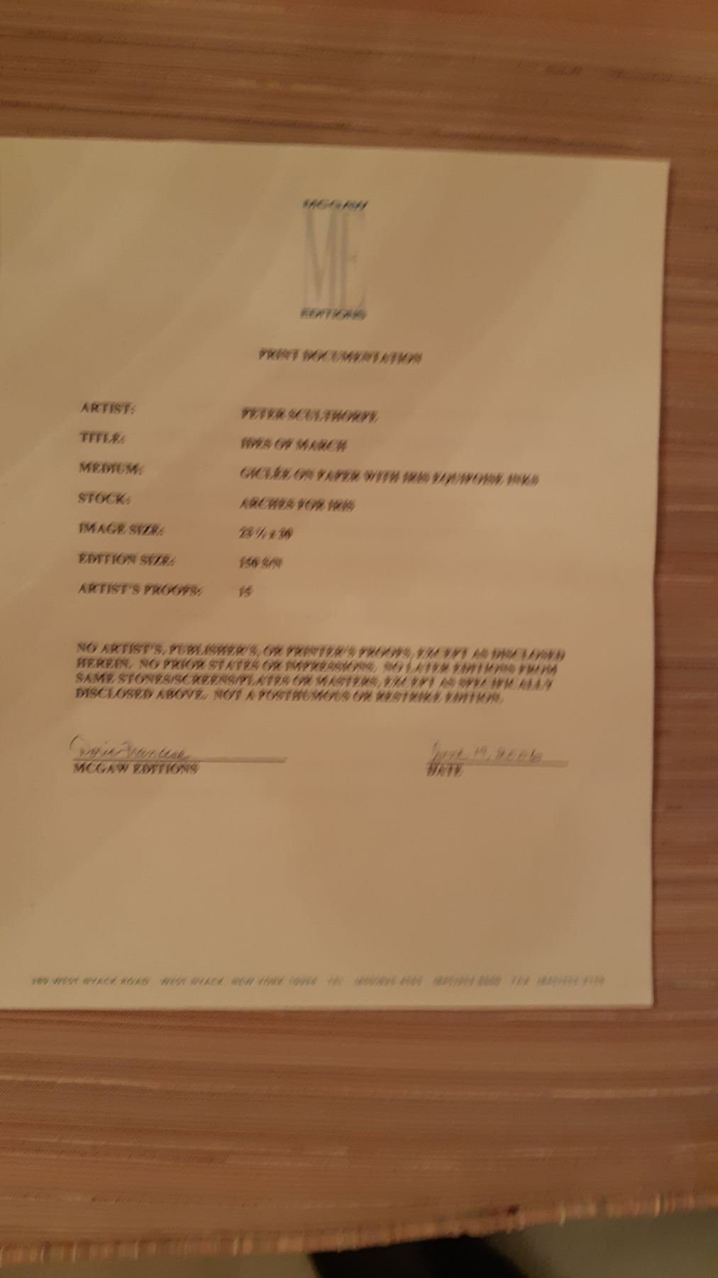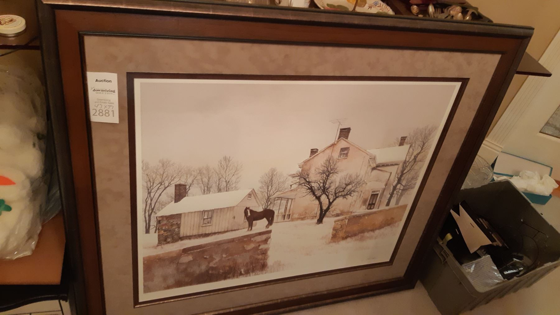 Size with frame is 43" wide and 37" tall. Print documentation included.